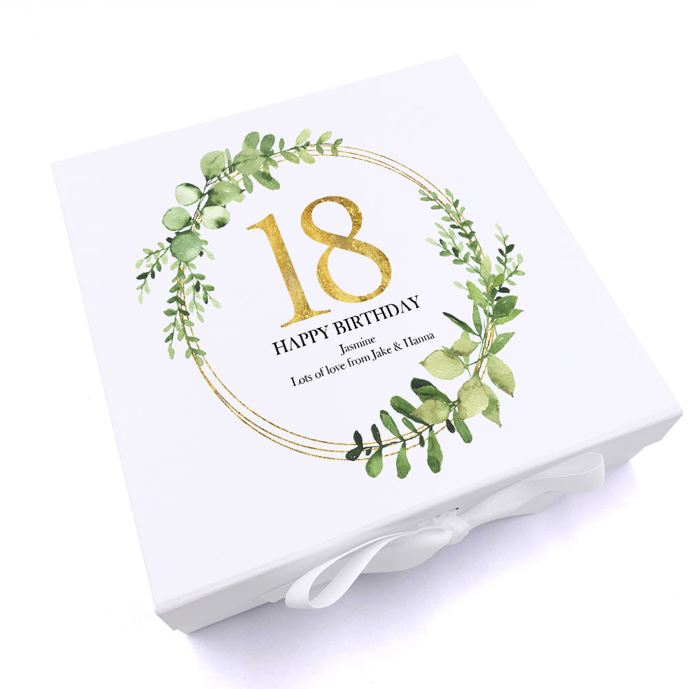 Celebrate the milestone of an 18th birthday with this sophisticated Personalised Keepsake Memory Box for her, featuring an elegant gold wreath design. This beautifully crafted box offers a special place to store treasured memories such as photographs, notes, and keepsakes from this significant life moment. The personalisation option adds a unique, heartfelt touch, making it a distinctive gift that she will cherish. Designed to combine style with sentiment, this memory box is the perfect way to honour her transition into adulthood while preserving precious memories for years to come.