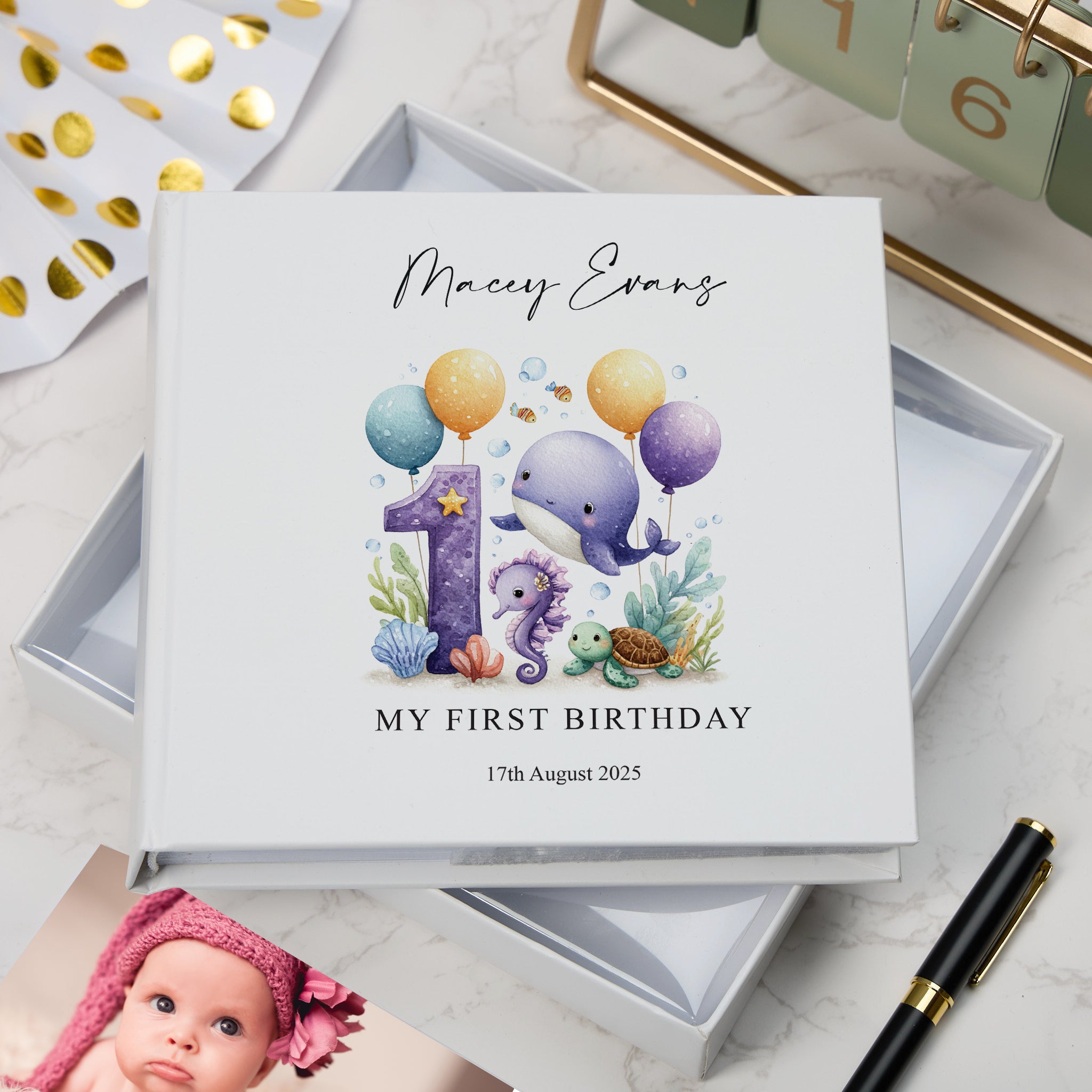 Celebrate your child's first milestone with this beautifully crafted personalised photo album, designed to preserve those precious early memories. Each album is customised with your child's name, making it a truly unique keepsake that grows with your family. Whether you're welcoming a baby boy or girl, this versatile album accommodates photographs from birth through the first year, allowing you to document every smile, milestone, and cherished moment. The album arrives elegantly presented in a gift box, making it an ideal present for new parents or a meaningful addition to your own nursery. Constructed with quality materials to ensure durability, this personalised keepsake becomes a treasured heirloom that families will revisit for years to come, capturing the magic of infancy in one beautiful collection.