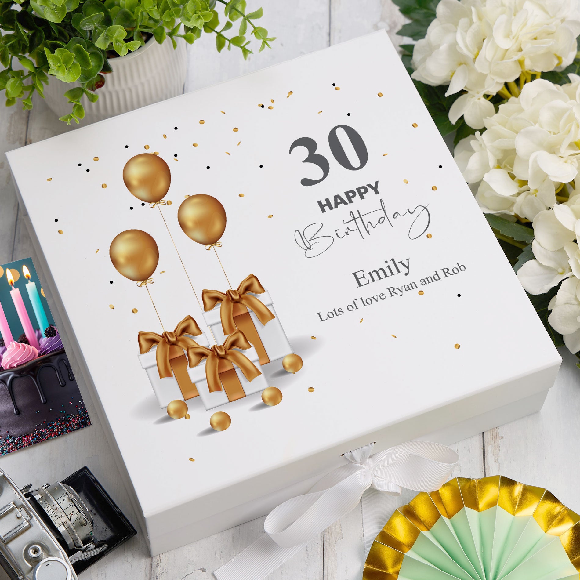 Gorgeous luxury personalised printed rigid card gift box, with lid that has a magnetic closure and is tied with a grosgrain ribbon. The personalised print on this luxury box is raised slightly to create a stunning embossed-style feature. The box itself is sturdy and durable - made from a luxurious 1200gsm white matt laminated rigid board. Available in two sizes and used as a gift box, as a memory box or as part of a hamper. Medium 17cm x 17cm x 8cm Large 30cm x 30cm x 9cm It can be used as a gift box, as a memory box or as part of a hamper.