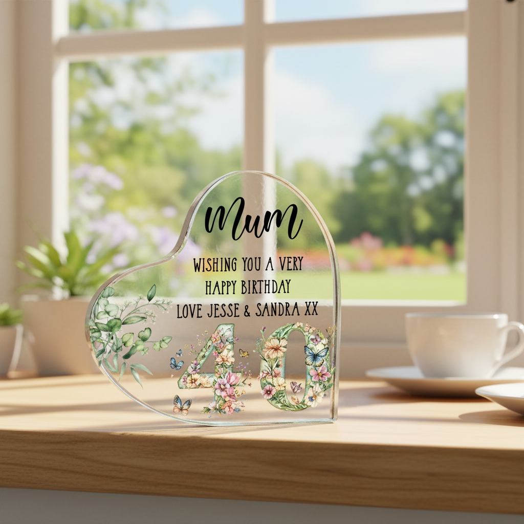 Celebrate an extraordinary milestone with this exquisite personalised 40th birthday gift. Crafted as a beautiful heart-shaped keepsake, this piece combines timeless elegance with heartfelt sentiment. Customise it with names and a personal message to create a truly one-of-a-kind tribute to eight decades of cherished memories. The compact 10 cm by 10 cm dimensions with 2 cm depth make it an ideal display piece for shelves, mantels, or bedside tables without overwhelming the space. Its refined proportions ensure it complements any interior décor whilst remaining a focal point worthy of admiration. Every detail speaks to quality and care. The piece arrives nestled in a luxurious silk-lined gift box, adorned with delicate floral and butterfly embellishments that add an extra layer of sophistication. This presentation transforms the gift-giving experience into a memorable occasion in itself, making it perfect for marking this significant birthday celebration with grace and distinction.