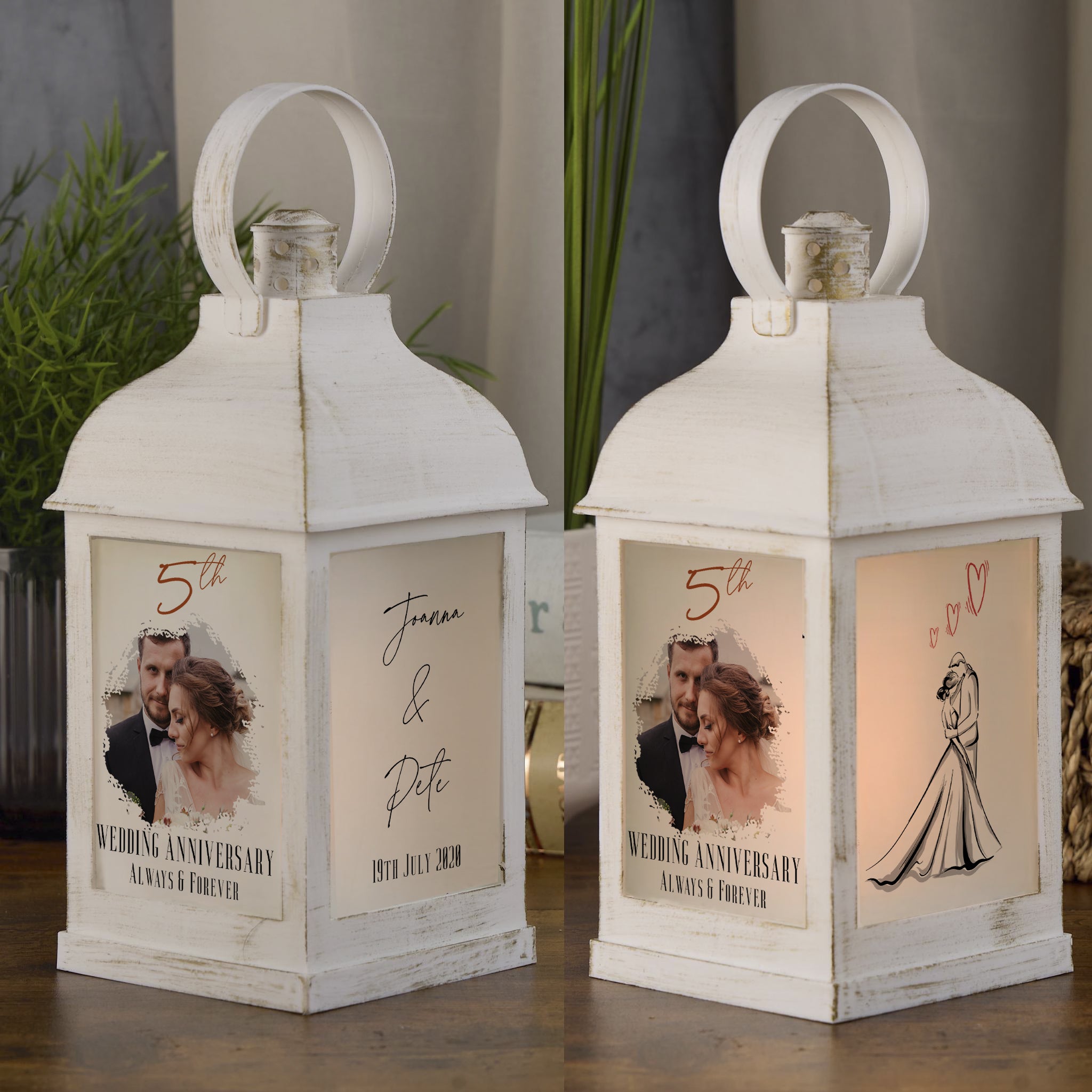This personalised 5th Anniversary Photo Lantern Gift is a distinctive and thoughtful present for couples celebrating their milestone. Featuring custom printing on all four sides, it displays two of your chosen photos, alongside the couple’s names, the important date, and an artistic sketch of the pair. The battery-powered lantern emits a warm, flickering orange flame that creates a cozy, ambient atmosphere in any room. Measuring 22.5cm by 10.5cm, it boasts a matt plastic finish and includes a handy hanging hoop for easy display. Operated via a switch at the base, it requires 3 AAA batteries (not included) and arrives in a protective gift box, ready for presentation.
