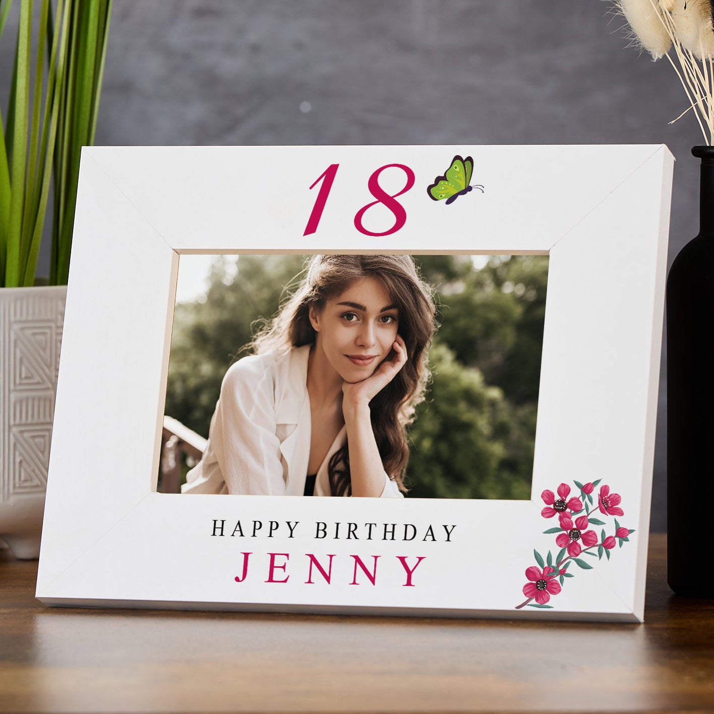 Personalised Any age Birthday White Photo Frame Gift With Flowers 16th, 18th, 21st, 30th, 40th, 50th, 60th, 70th, 80th