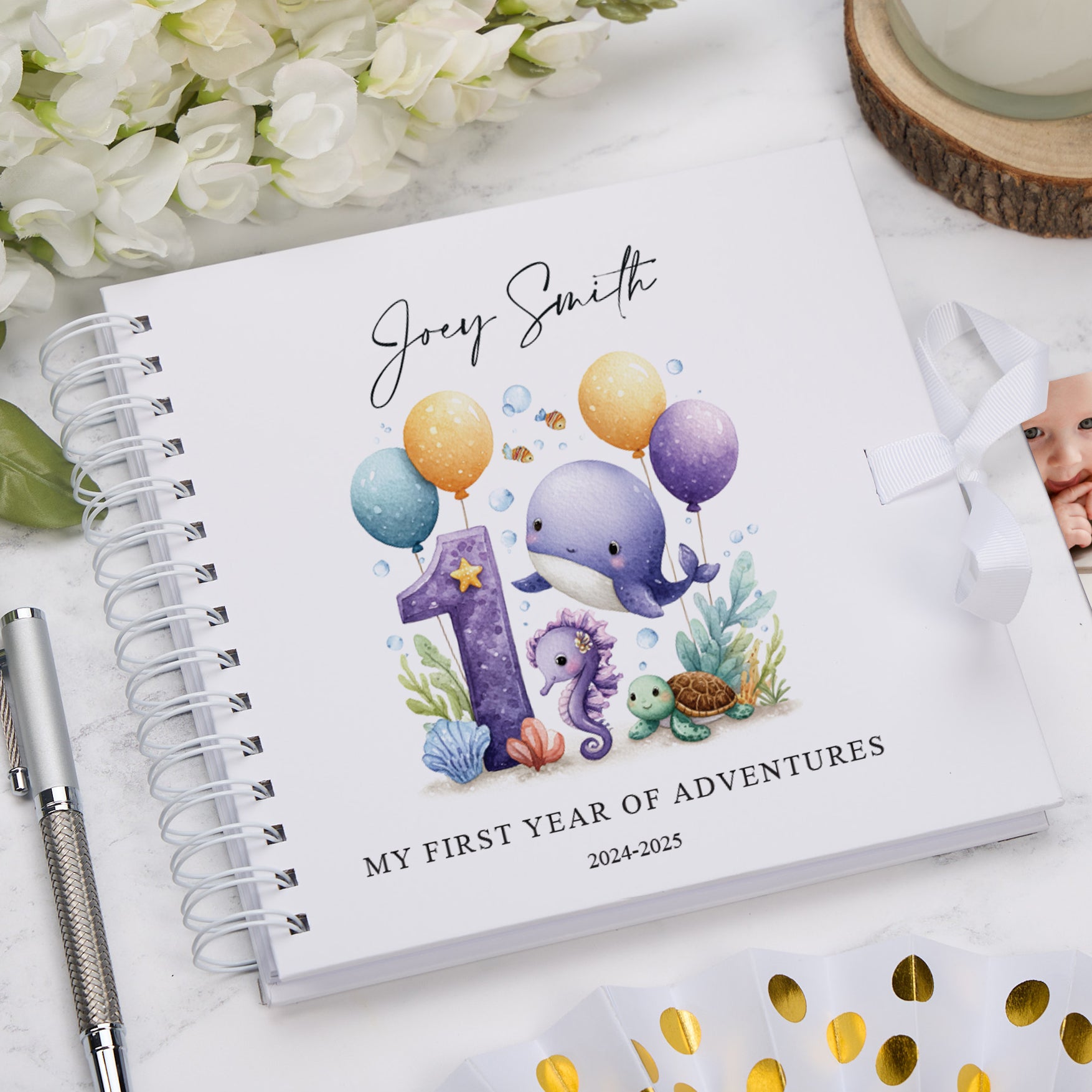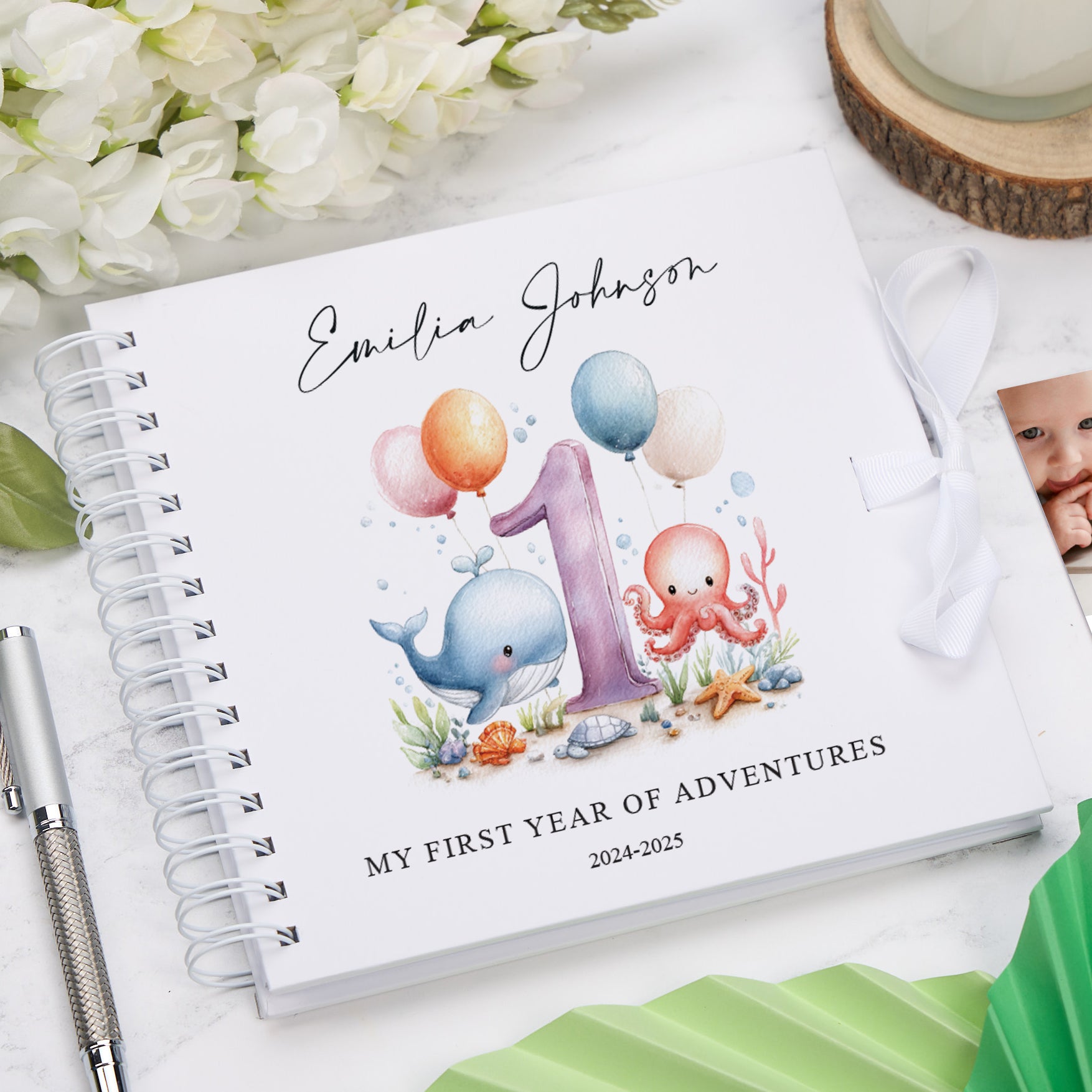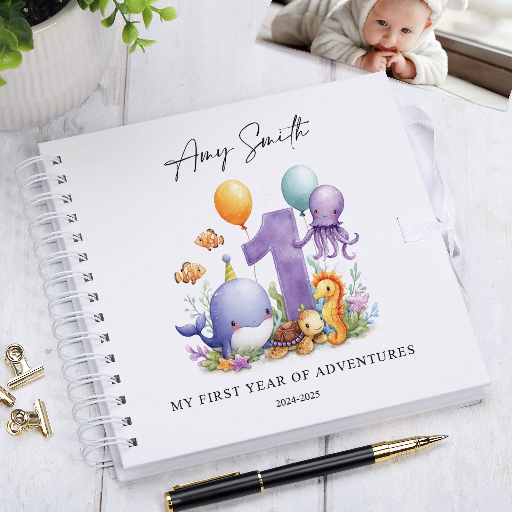 Document your baby boy or girl's remarkable first year with this beautifully designed personalised scrapbook, adorned with enchanting sea mammal illustrations. This comprehensive memory album provides thoughtfully organised sections to record developmental milestones, first achievements, and treasured photographs throughout those fleeting twelve months. The safari theme adds a whimsical yet sophisticated aesthetic that appeals to modern parents seeking something distinctive. Personalisation transforms this into a one-of-a-kind keepsake that celebrates your daughter's unique journey from newborn to toddler. With ample space for notes, mementos, and reflections, this scrapbook becomes an heirloom-quality record that you'll treasure revisiting as your child grows, capturing the magic of infancy in tangible form.