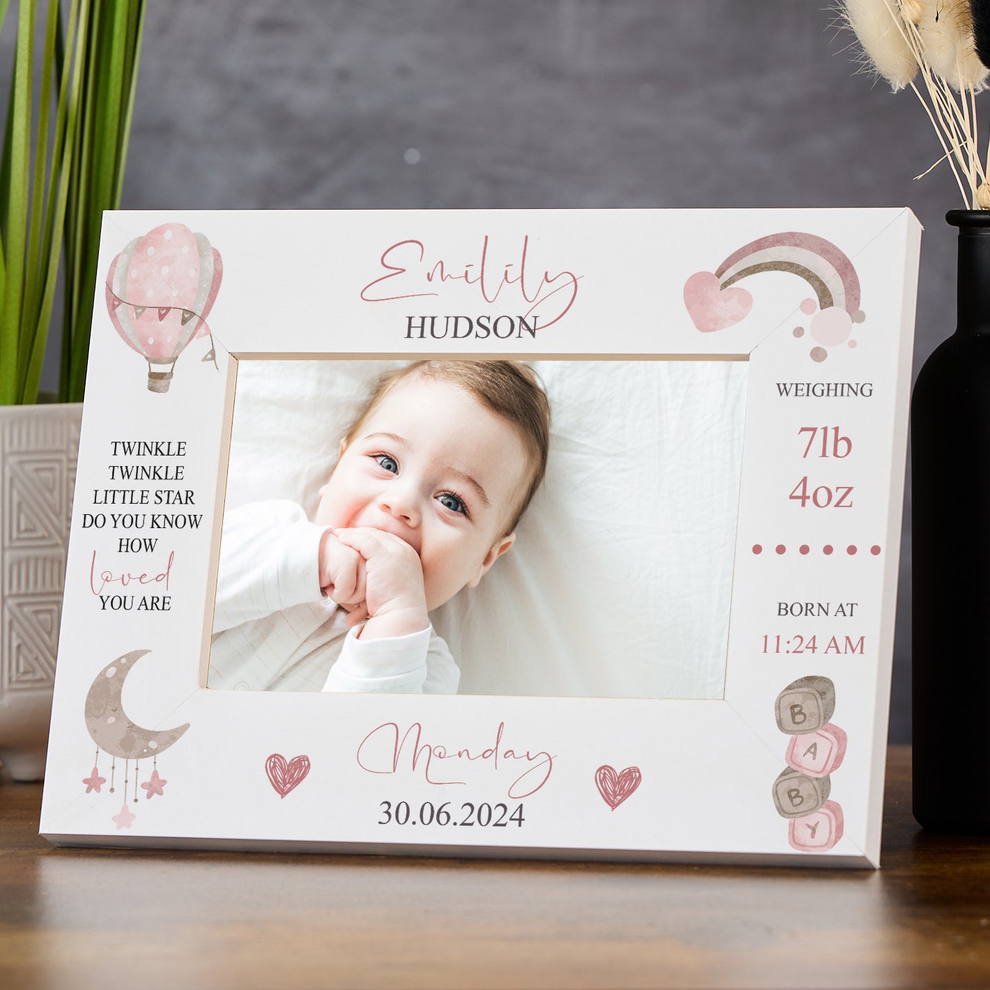 This personalised baby photo frame combines a charming Watercolour design with the baby's birth details, creating a heartfelt keepsake. Finished in crisp white, the frame highlights the printed details elegantly. It fits one standard 6" x 4" photo, allowing you to showcase a treasured memory. Designed for versatility, it includes a rear stand to sit securely on any flat surface, and can also be wall hung, making it a practical and sentimental addition to any nursery or home.