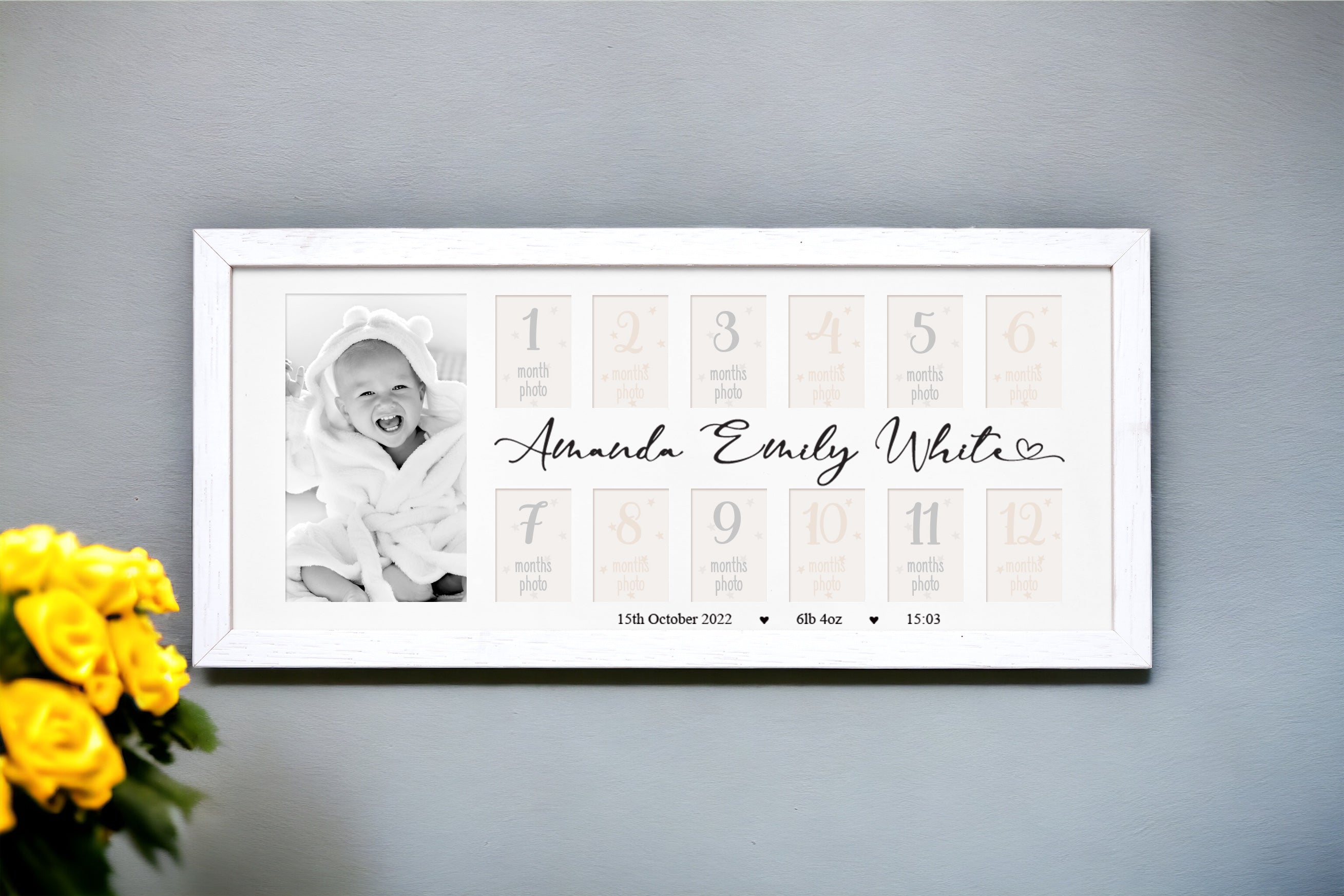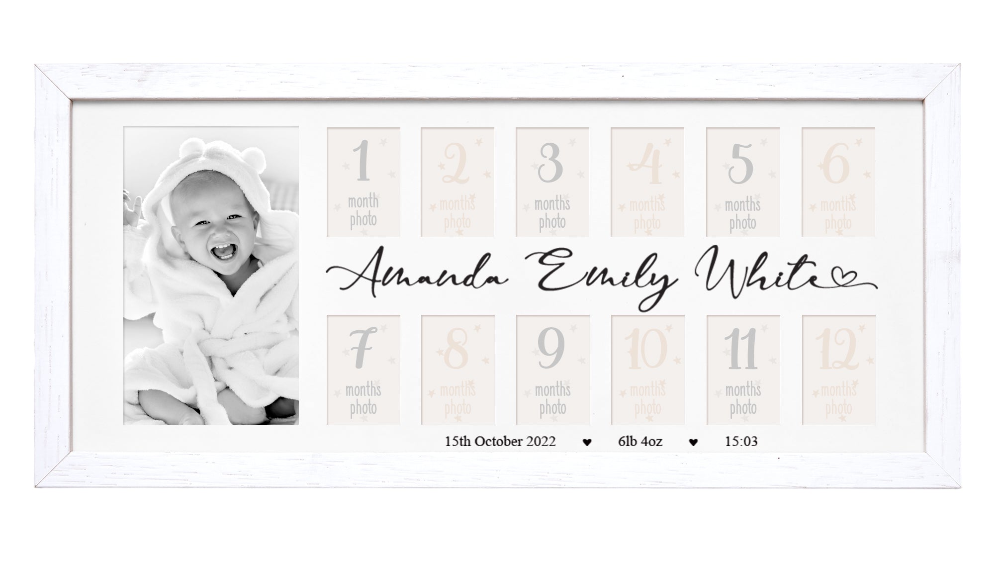 Preserve the precious memories made during your little one's first year with this sweet multi-aperture photo frame. Complete with a window box featuring personalised details, this makes a magical gift for new parents. We print the name and birth date if required on the frame as shown. Measures 40cm x 20cm Create a lasting reminder of your bundle of joy's first 12 months with this elegant and personalized photo frame. Customizable with your baby's name and birth date, this frame will be a treasured keepsake for years to come. Its window box with personalised details makes it perfect for gifting to new parents. With multiple apertures, it's a beautiful and practical way to display your baby's photos. Measuring 40cm x 20cm, it's the perfect size to showcase your little one's milestones.