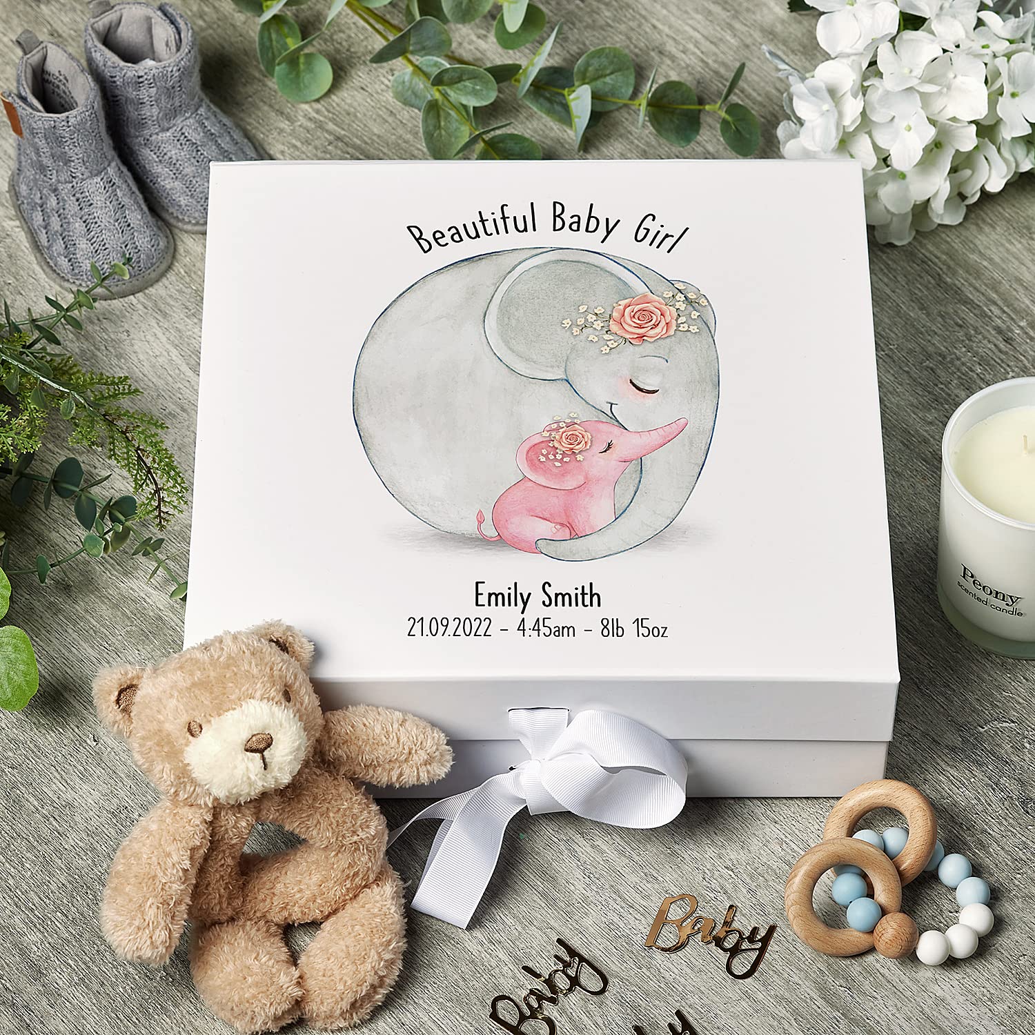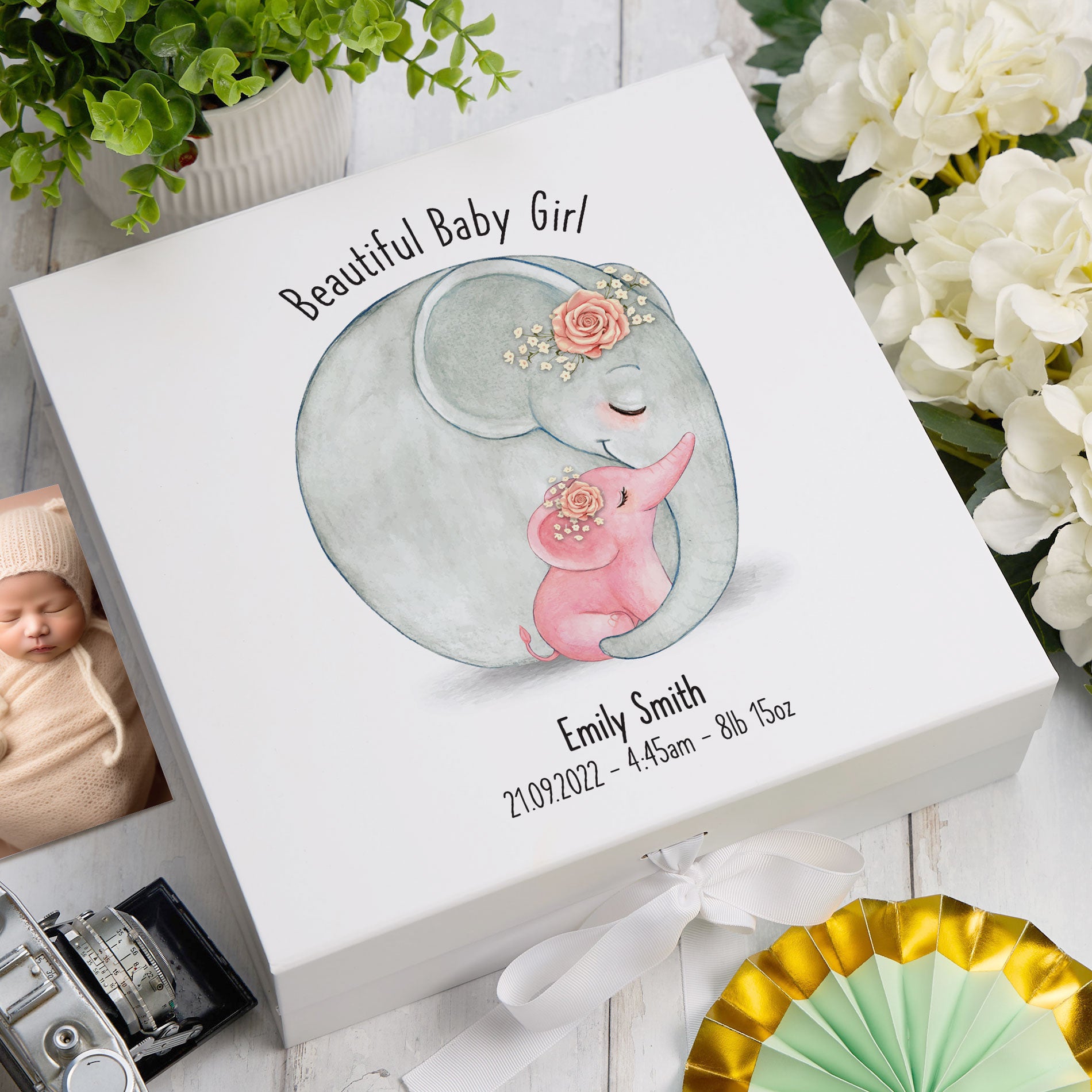 Personalised Beautiful Baby Girl Memory Keepsake Box With Elephant Sketch