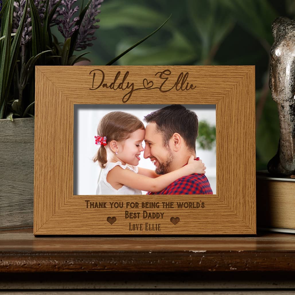 The frame has a oak wood finish and comes with "Daddy and a name" on the top...and thank you for being the world's best Daddy and the personalisation underneath. Please select the photo frame size you require, the sizes are for the photo size. There is a stand at the rear so will sit flat on any surface.