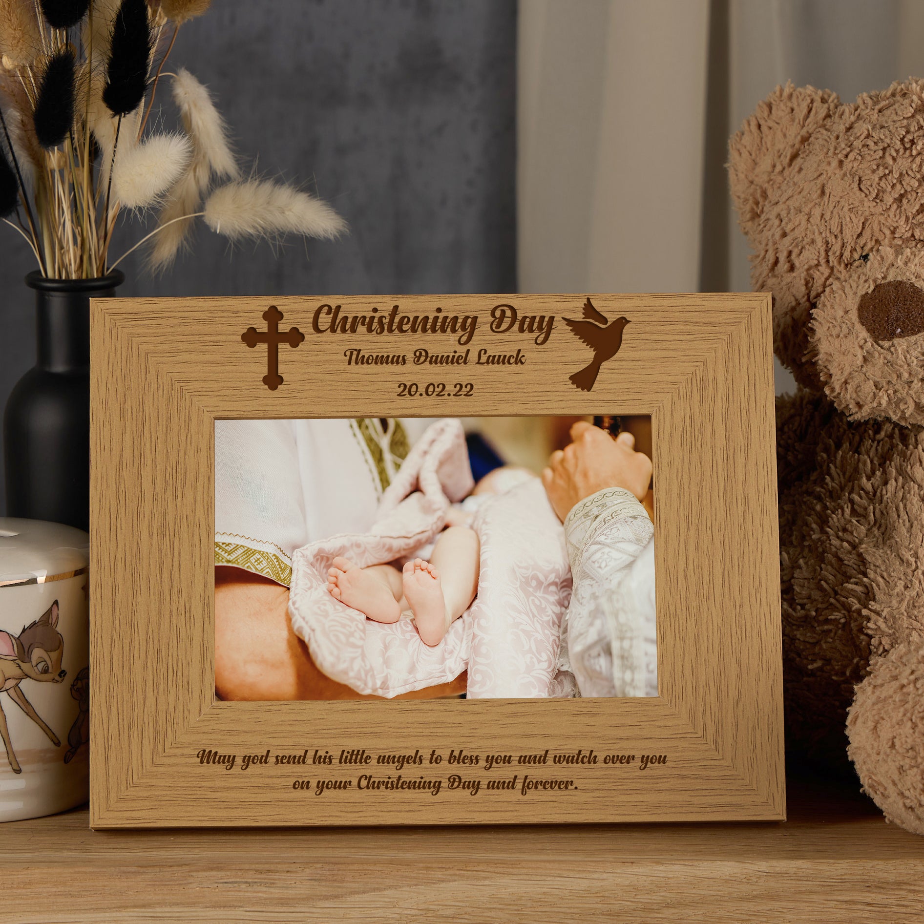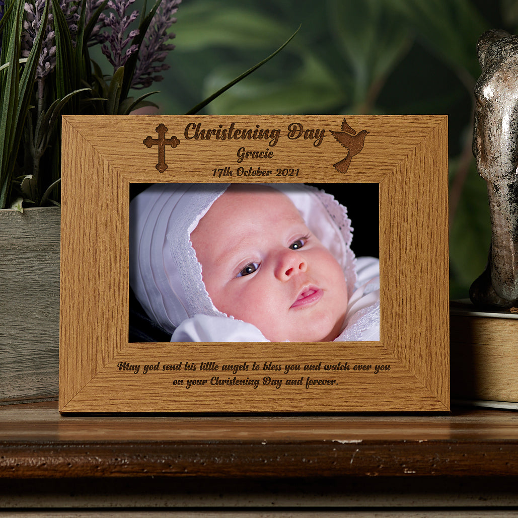 The frame has a solid wood finish with the engraving of "Christening Day" and "May god send his little angels to bless you and watch over you on your Christening Day and forever" on the bottom part of the frame. Underneath Christening Day you can add the wording of your choice...e.g. Name and date, etc This can be done during checkout, though should you miss it, can always be messaged to us through your order. Please select the photo frame size you require, the sizes are for the photo size. There is a stand at the rear so will sit flat on any surface