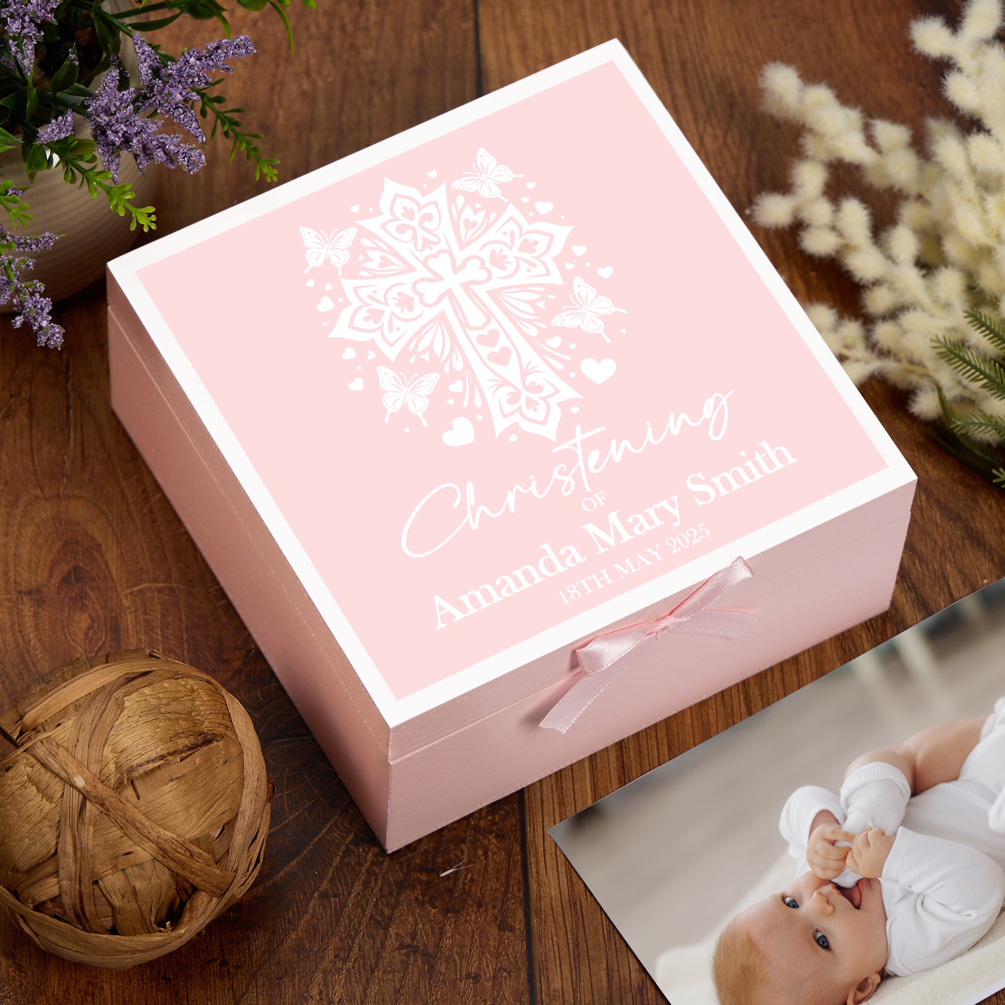 A customised keepsake box for Christening, perfect for both boys and girls, with a variety of color...