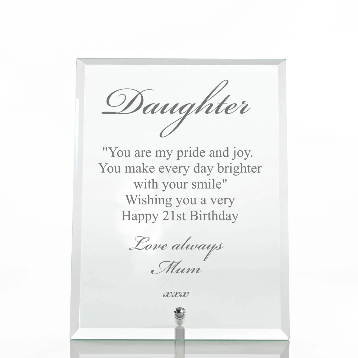 This personalised engraved glass plaque makes a thoughtful and elegant gift for your daughter on any special occasion. Crafted with precision, it allows you to add your own heartfelt sentiment, making each piece unique and meaningful. The clear glass features engraving that is cut out from the surface, ensuring a timeless and sophisticated look without added color. Ideal for birthdays, graduations, or simply to show appreciation, this bespoke plaque serves as a lasting keepsake your daughter will treasure. Customize the message to perfectly express your feelings and create a cherished memory.