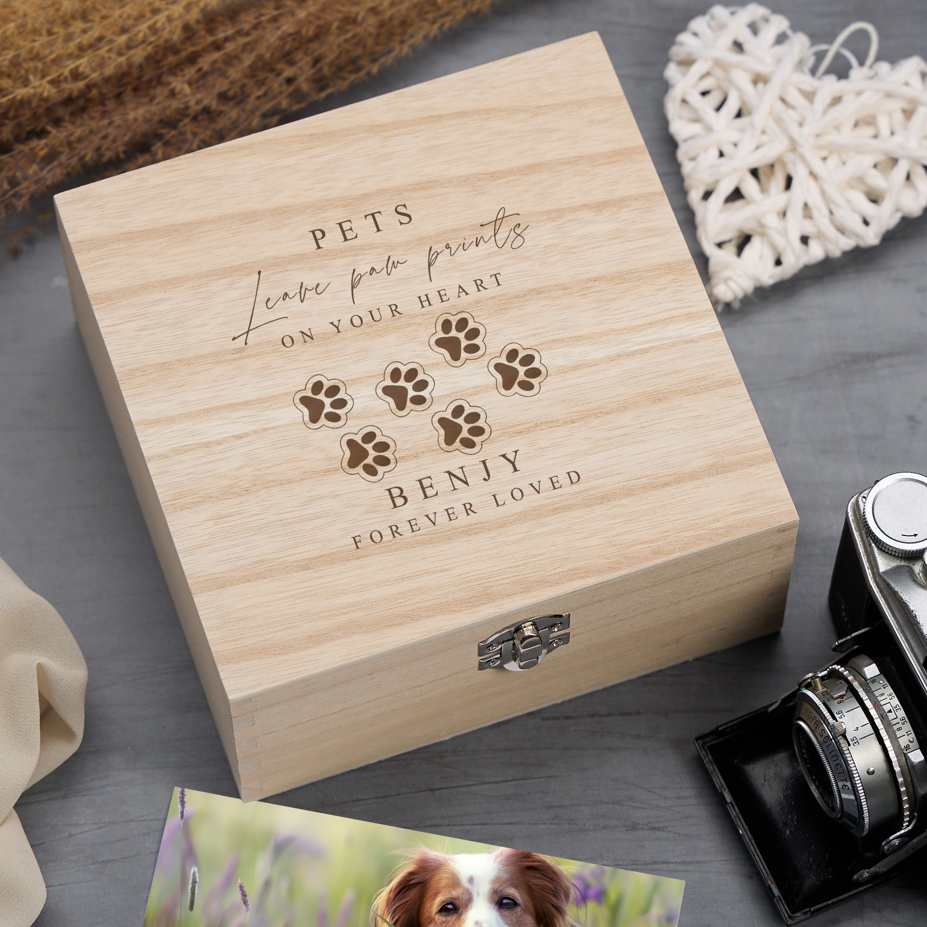 The Personalised pet Memory Keepsake Box Gift is the perfect way to treasure and remember one's special furry friend. Made with a beautiful sentiment, this keepsake box is a timeless and elegant piece that will display your cherished memories for years to come. With its personalised touch, it's a unique and thoughtful gift for any pet lover. Preserve your memories in style with this stunning keepsake box.