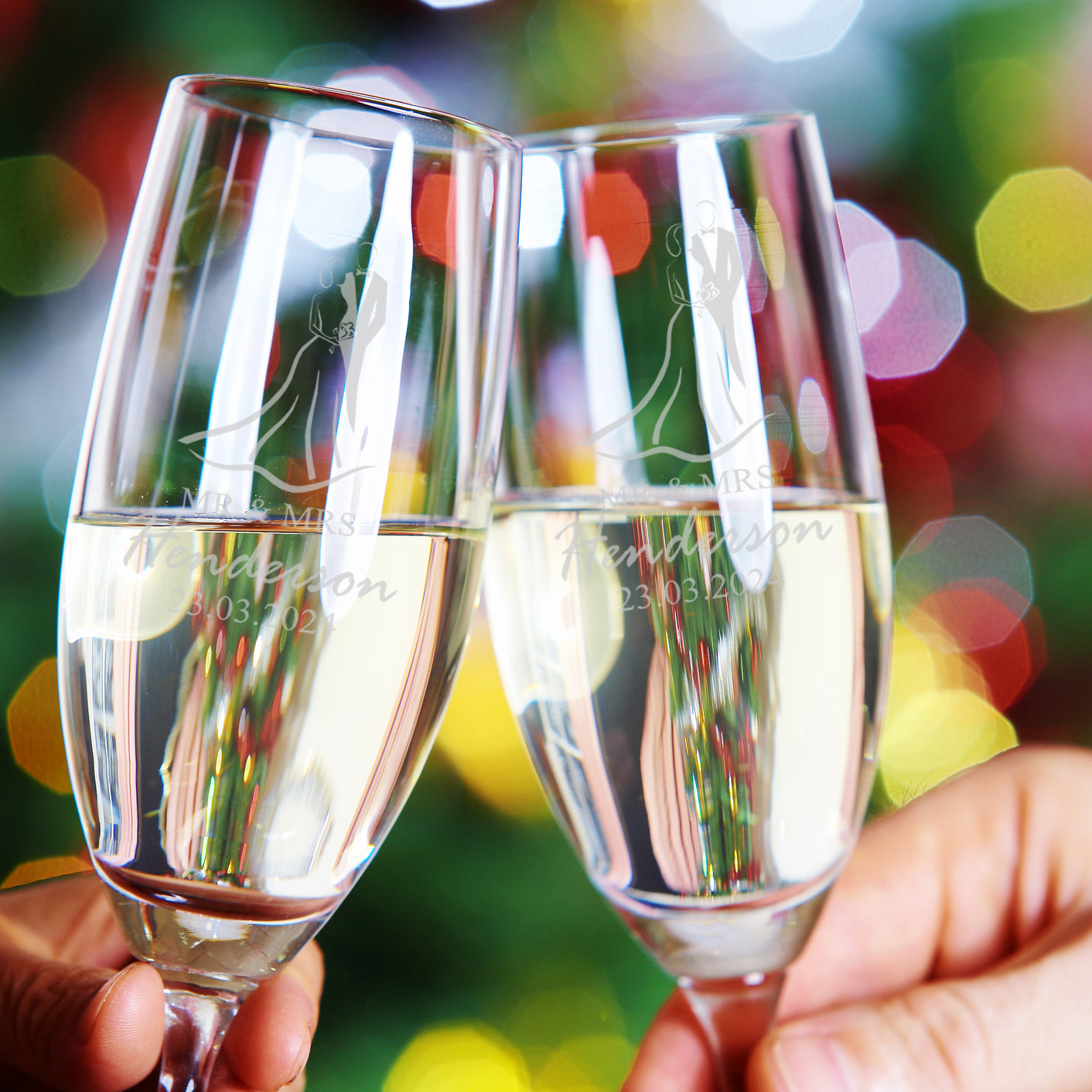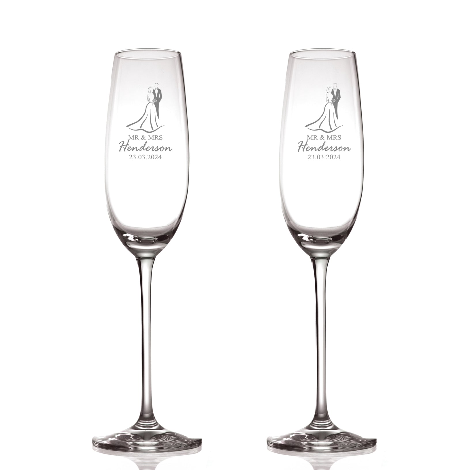 This set includes two elegant, personalised champagne glasses, perfect for celebrating the union of a happy couple. They make a thoughtful and memorable gift for a wedding or anniversary.