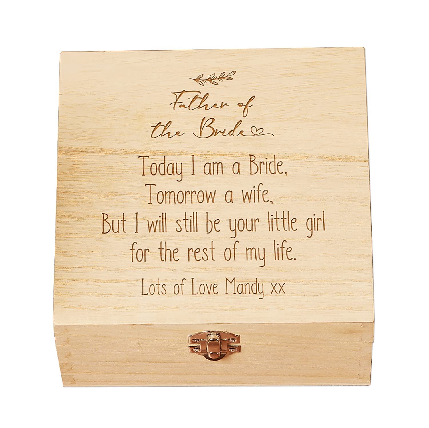 Made from wood this box is an ideal way to store those important keepsakes including 6" x 4" photos. The box is hinged for easy opening and comes with a clip closure. Dimensions: 17 x 17 x 7 cm All you need to do is message us during checkout, though if missed then please send us a message through you completed order instead