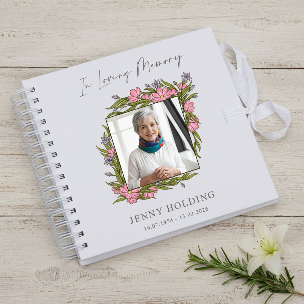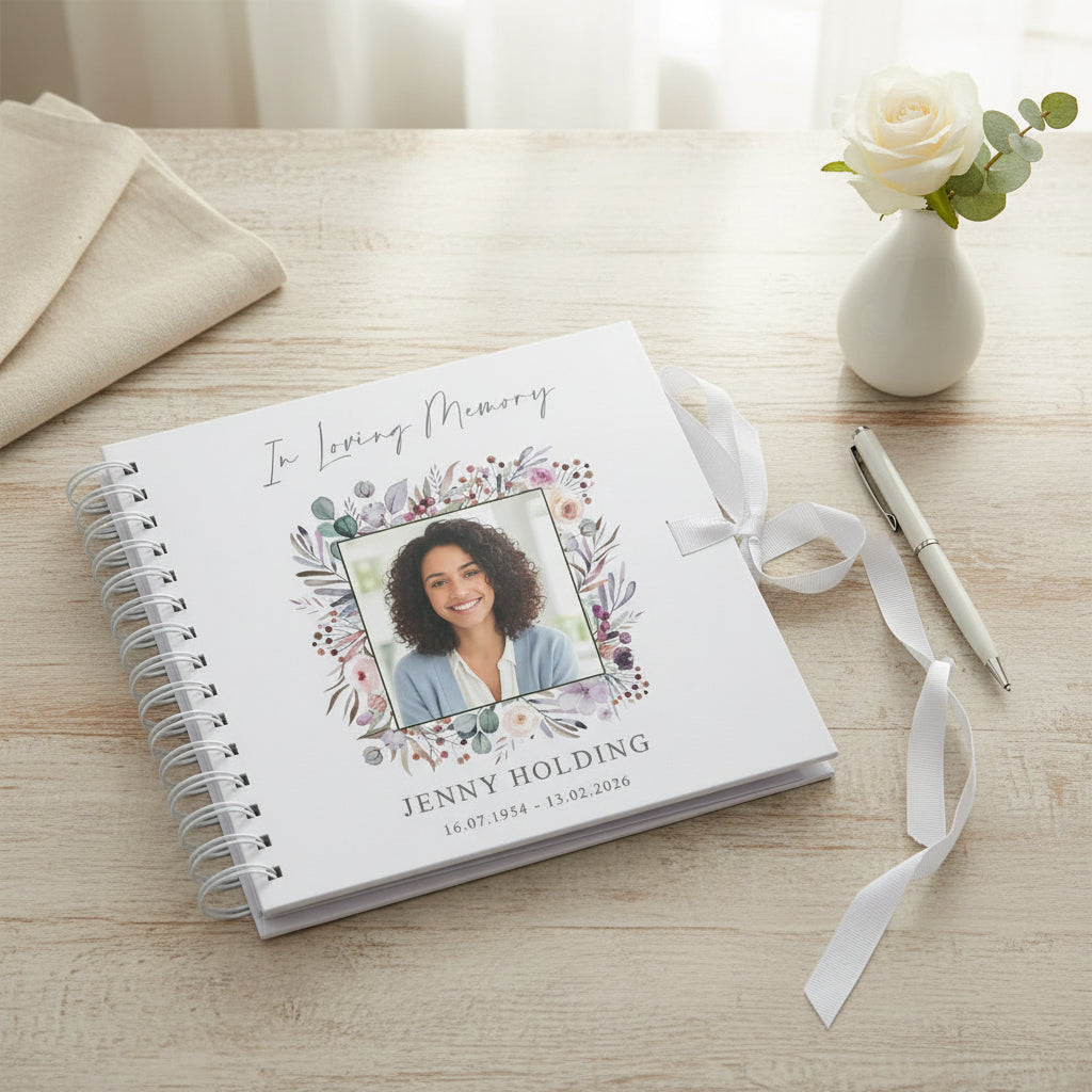 Honour and celebrate the life of a loved one with this beautifully crafted personalised memorial guest book. Designed with dignity and compassion, this hardcover condolence memory book provides a meaningful space for family, friends, and guests to share cherished memories, heartfelt messages, and personal reflections during a funeral service, wake, or celebration of life. Each book is personalised with a custom photograph and dedicated details printed directly onto the front cover, creating a lasting tribute that captures the essence of the person being remembered. This makes it an ideal keepsake for families to treasure for years to come.