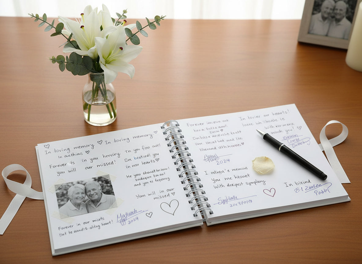Hardcover design — provides protection and a premium feel Perfect for funeral services, memorial gatherings, wakes, and celebrations of life, this guestbook serves as both a functional record and an emotional keepsake. Guests can write personal messages, share favourite stories, or offer words of comfort, creating a beautiful collection of memories and support for grieving families.