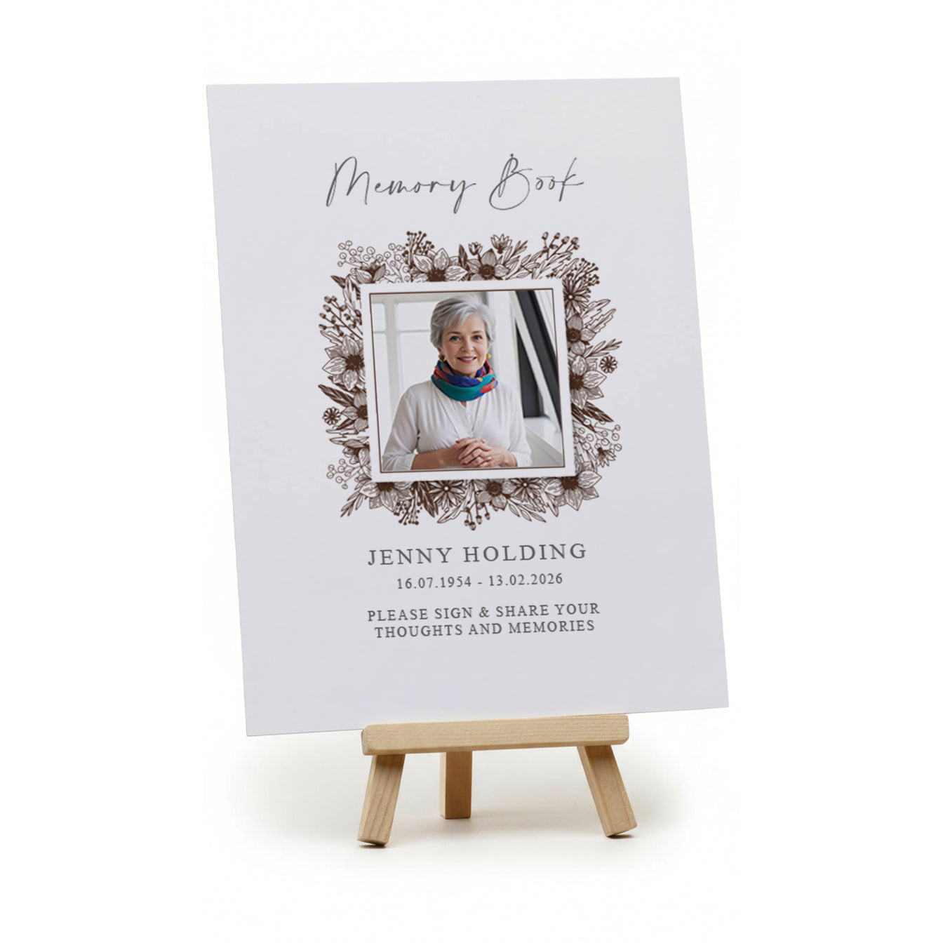 Each sign is customised with a printed photograph and personal details of the deceased, creating a meaningful tribute that reflects their life and legacy. The compact A5 dimensions make it ideal for display on tables, mantlepieces, or entrance areas without overwhelming the space.