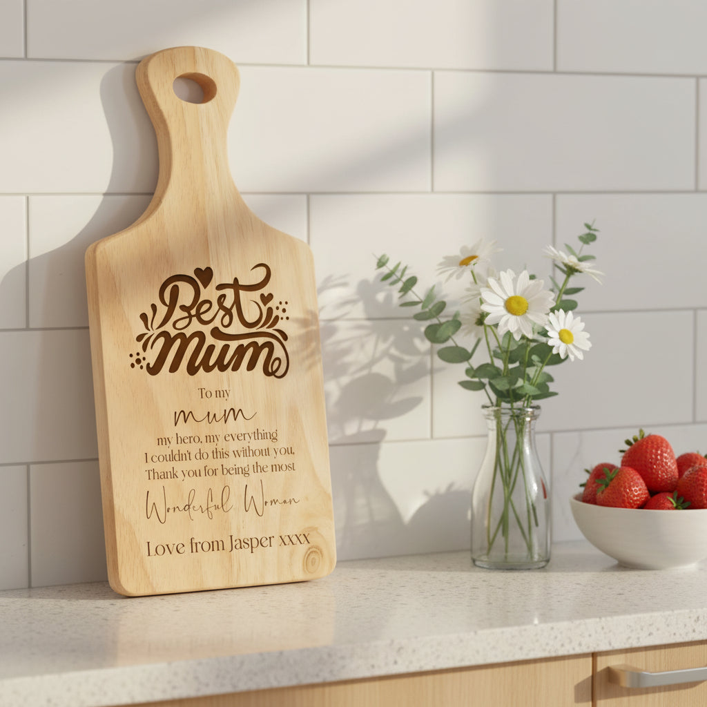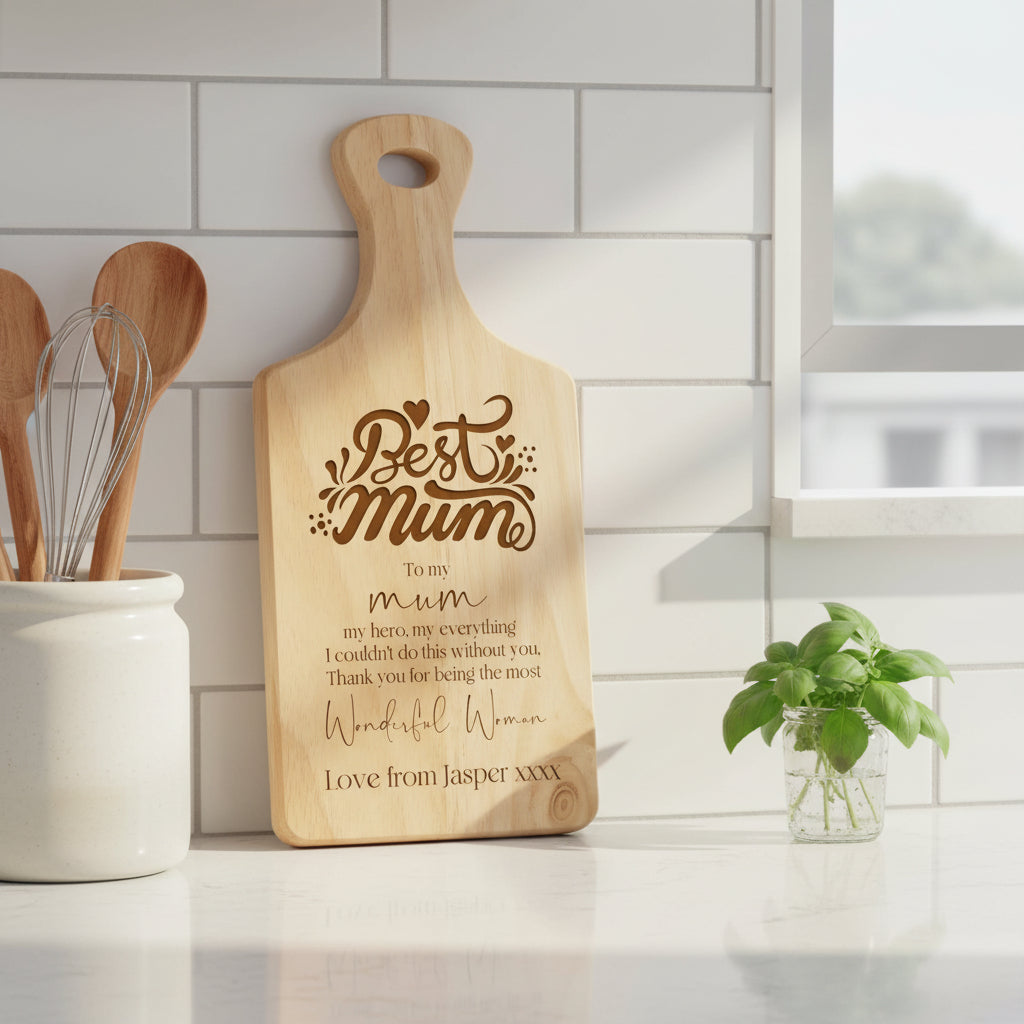 Personalised Gift For Mum Engraved Wooden Chopping Board For Kitchen Decoration. Measuring a generous 34 x 16 cm, this board offers ample workspace for food preparation whilst serving as an attractive kitchen focal point. Crafted from quality wood, the engraved personalisation transforms this practical kitchen essential into a meaningful keepsake that celebrates the special bond between you and your mum. The durable construction withstands regular use, whilst the elegant design complements any kitchen aesthetic. Whether used daily for meal preparation or displayed as a treasured decorative piece, this chopping board combines functionality with sentimental value. An ideal gift for mothers who appreciate both thoughtful personalisation and kitchen practicality, this board makes a lasting impression that goes beyond ordinary tableware.