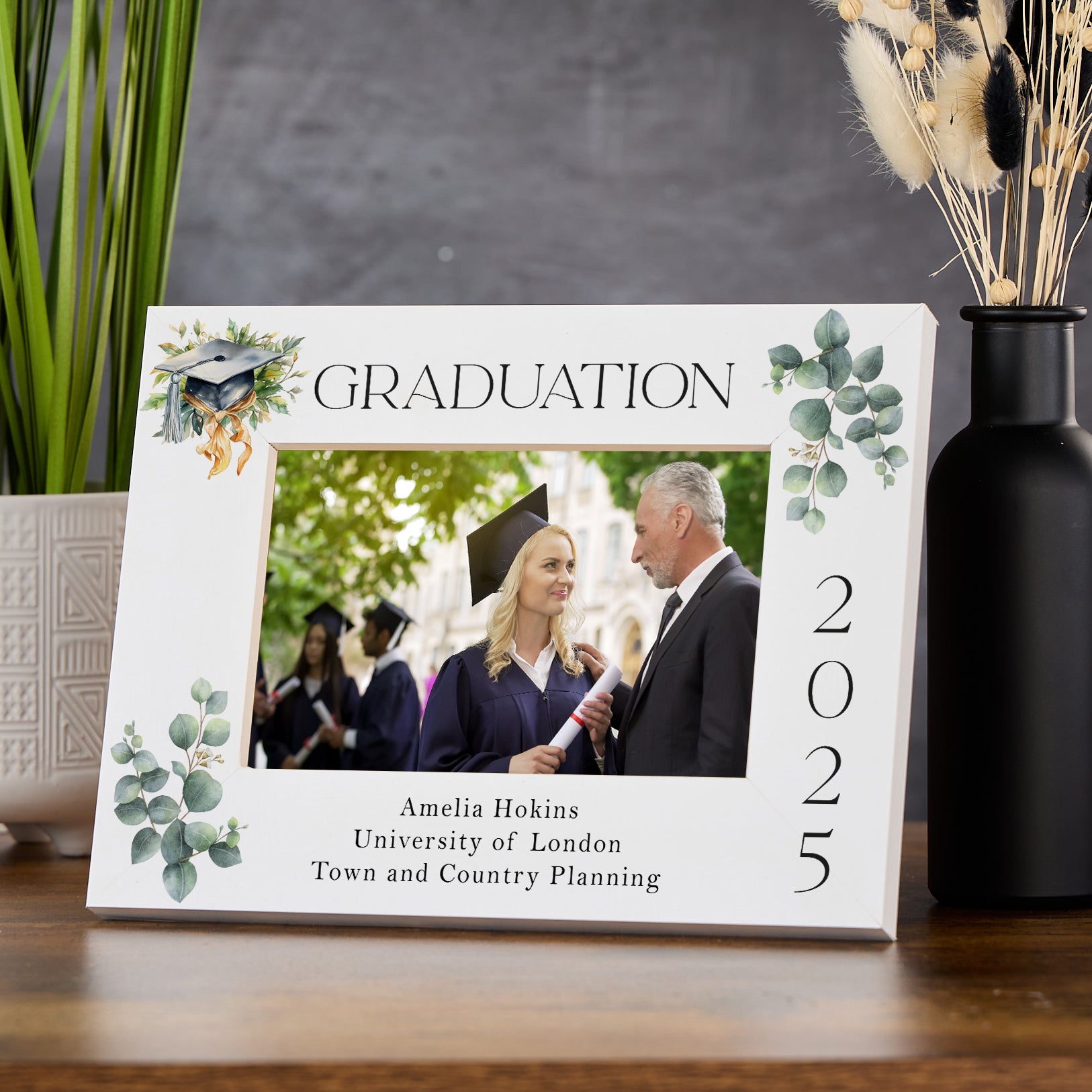 Personalised Graduation White Wooden Photo Frame With Green Elements offers a sophisticated commemoration of academic achievement. This meticulously crafted keepsake features a pristine white wooden frame complemented by distinctive green accents symbolizing growth and success. Each frame can be customized with graduate details including name, institution, degree, and graduation year. The precision-engineered construction ensures durability while maintaining an elegant aesthetic suitable for display in professional or domestic environments. Dimensions accommodate standard graduation photographs, creating a timeless memento that preserves the milestone achievement for years to come.
