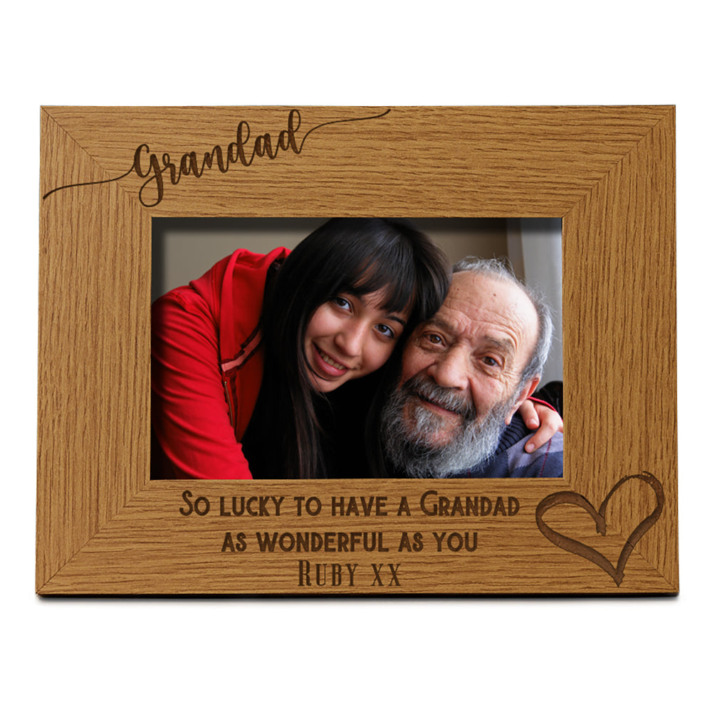 The frame has a solid wood finish with the engraving of "Grandad" on top along with "So Lucky to have a Grandad as wonderful as you" and then the personalisation of your choice. Please select the photo frame size you require, the sizes are for the photo size. Can be both wall hung as well as stood flat.