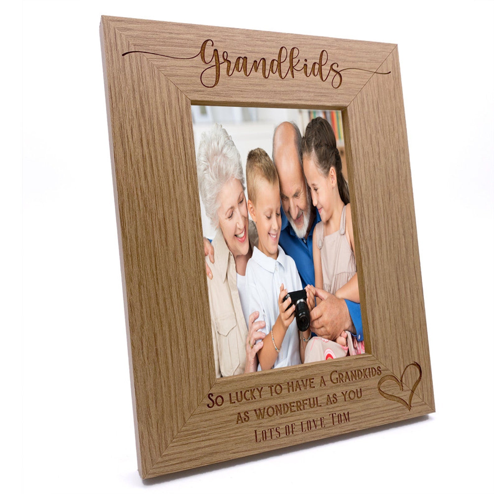 Personalised Grandkids Love Heart Engraved Portrait Photo Frame Gift A lovely wooden frame to display that all important or memorable photo . The frame has a oak wood finish with and comes with "Grandkids" on top and "So lucky to have a Grandkids as wonderful as you" and then the wording of your choice Please select the photo frame size you require, the sizes are for the photo size. There is a stand at the rear so will sit flat on any surface. Please simply message us during checkout but should you miss it then simply message us with your requirements from your order We just need the bottom line for engraving.