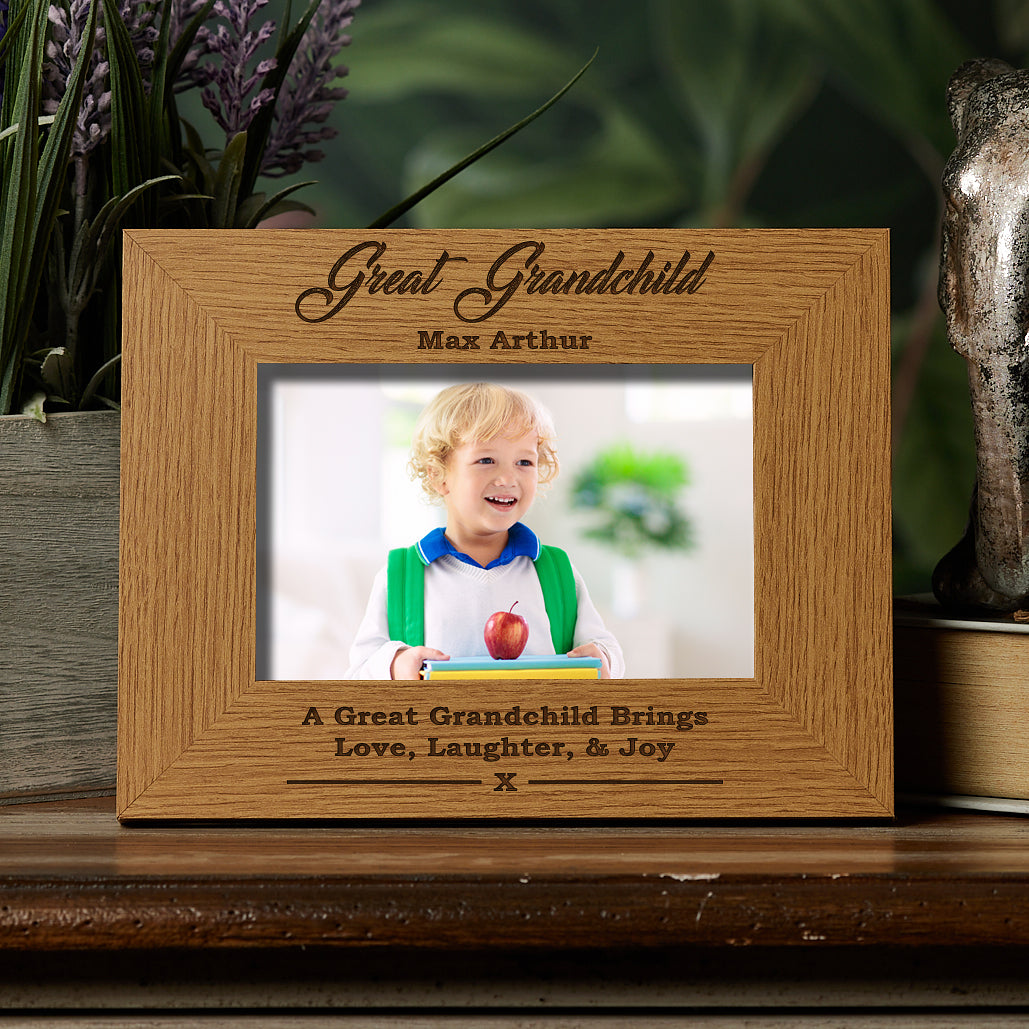The frame has a solid wood finish with the engraving of "Great Grandchild" and "A Great Grandchild Brings Love, Laughter & Joy" on the bottom part of the frame. Under Great Grandchild there is room to add the name of your choice...can add more too such as a birth date if required. All you have to do is message us in the gift section when checking out or if you forget or miss it then simply message us through your order. Please select the photo frame size you require, the sizes are for the photo size. There is a stand at the rear so will sit flat on any surface