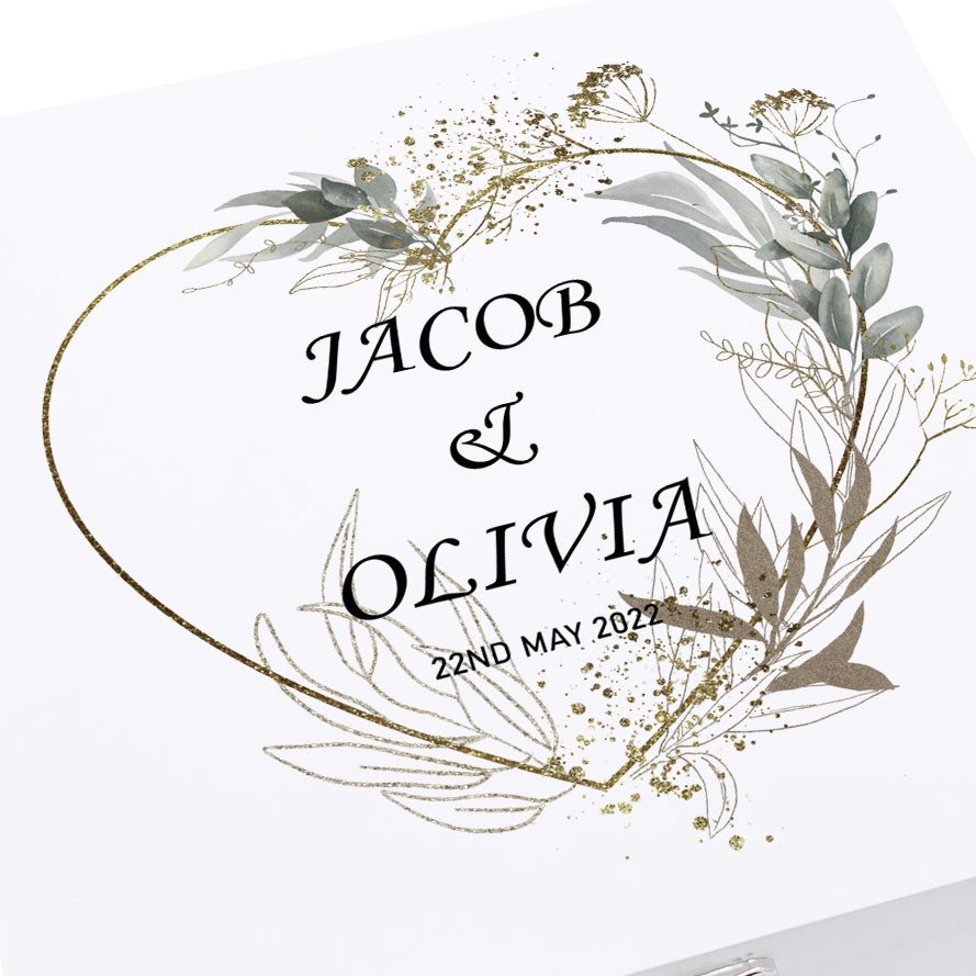 Personalised Luxury Wooden Wedding Box Keepsakes With Silver Green Leaf Heart