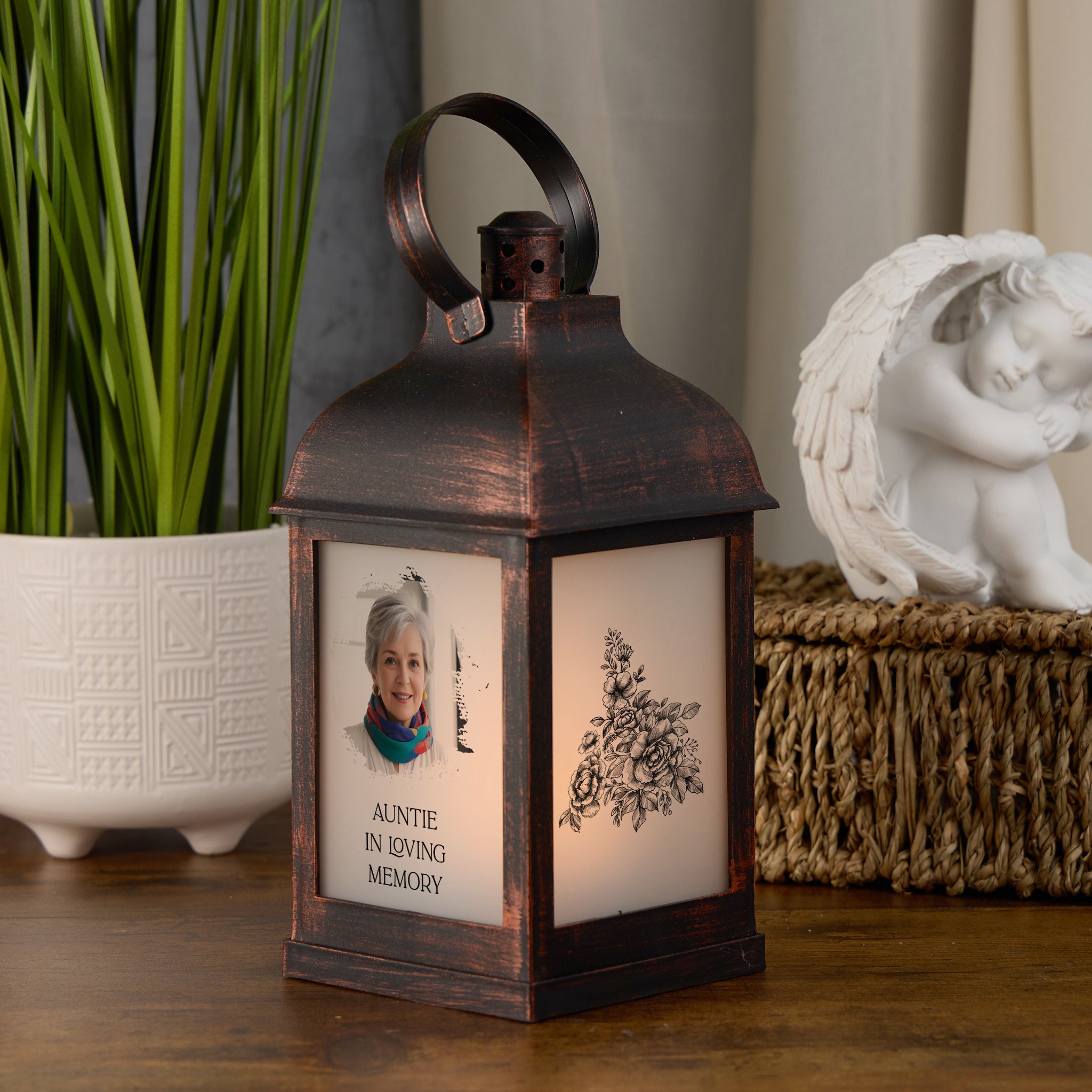 Personalised Memorial Photo Upload Lantern, Memorial Candle, Auntie Remembrance With Rose