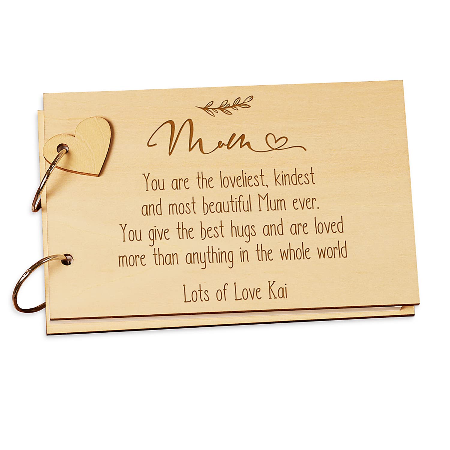You can stamp in dates and make annotations to the pages easily, and even create fold-out pieces and pockets if you wish! Or simply have written memoirs from guests and relatives. The ring binding allows you to fill your pages as thickly as you like, so you can bring dimension to your designs. This scrapbook also uses high-quality paper that is strong and absorbent so that you can go wild with glues, paints, tapes and decorations! Preserve the good old days with a beautiful scrapbook that you can personalise, whether you?re intending to give it to a loved one or simply to build yourself. This is the perfect way to record your best memories! Size: 14.8 x 9.8 cm 30 Pages - More can easily be added. The personalisation is done into the wooden front cover.
