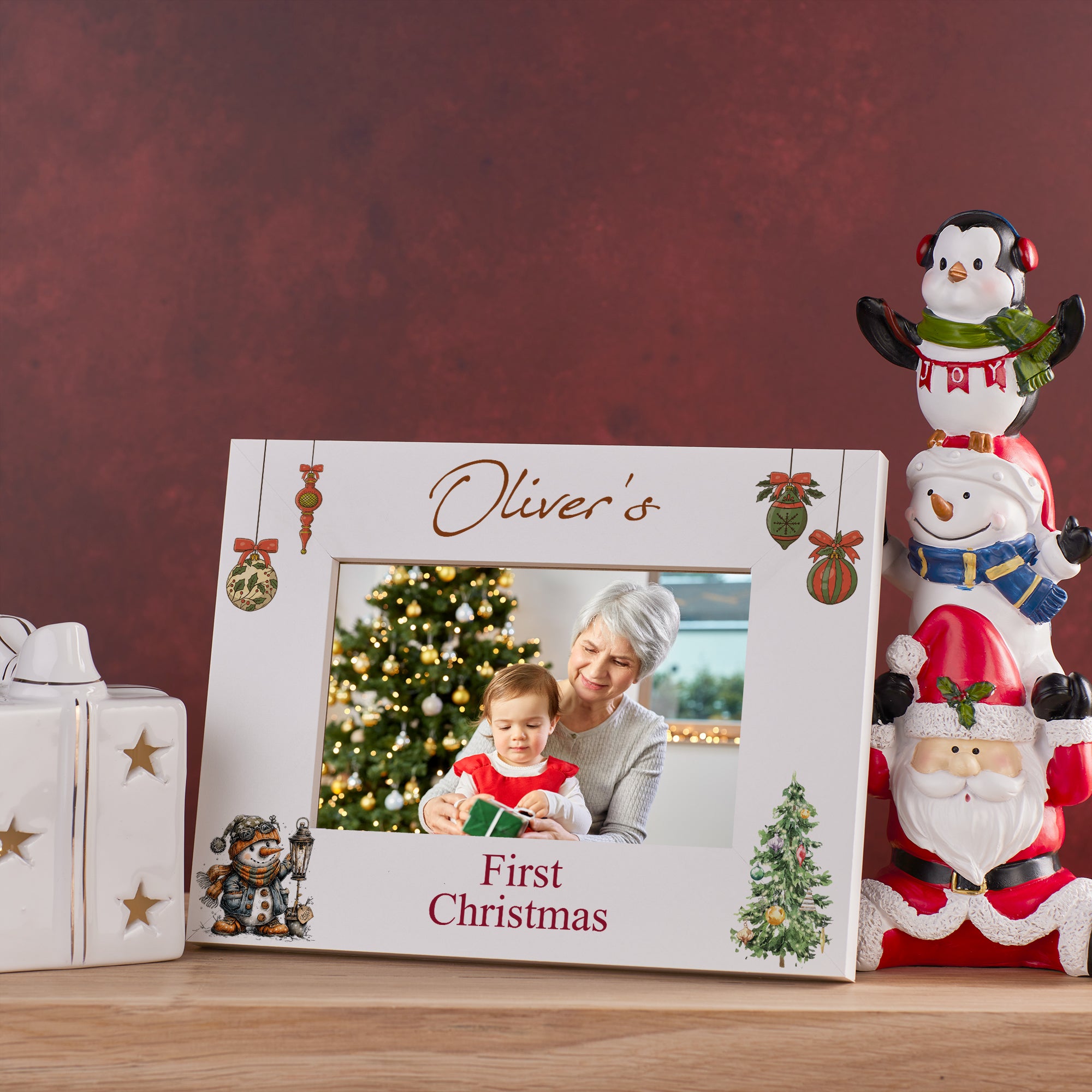 Commemorate your little one's inaugural Christmas with this elegant personalised photo frame. Crafted in crisp white with an enchanting snowman motif, it provides the perfect backdrop for a treasured 6" x 4" photograph. The integrated rear stand allows effortless display on shelves, dressers, or mantlepieces, making it an ideal decorative keepsake. Personalisation transforms this into a bespoke memento that captures the significance of this milestone moment, offering enduring sentimental value for years to come.