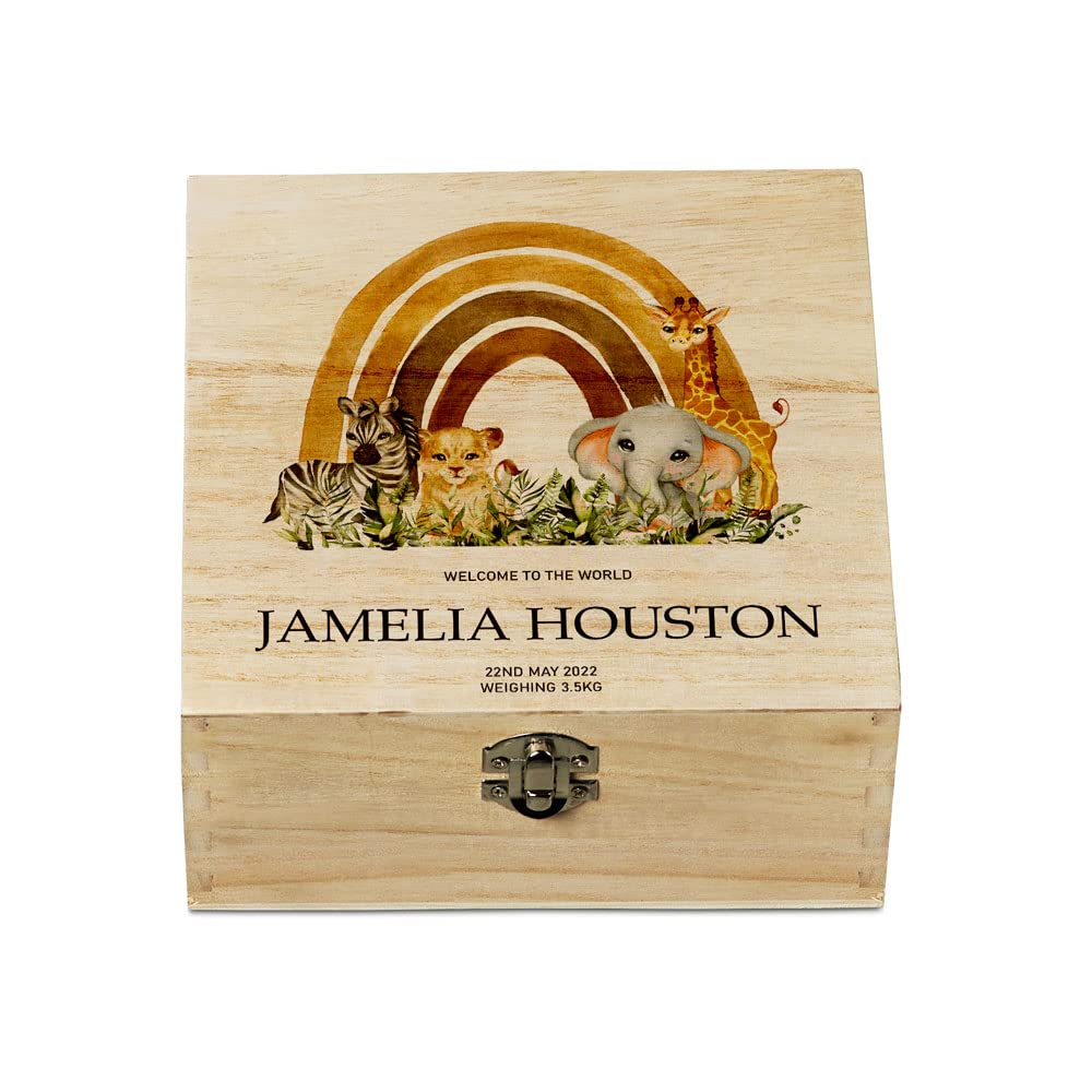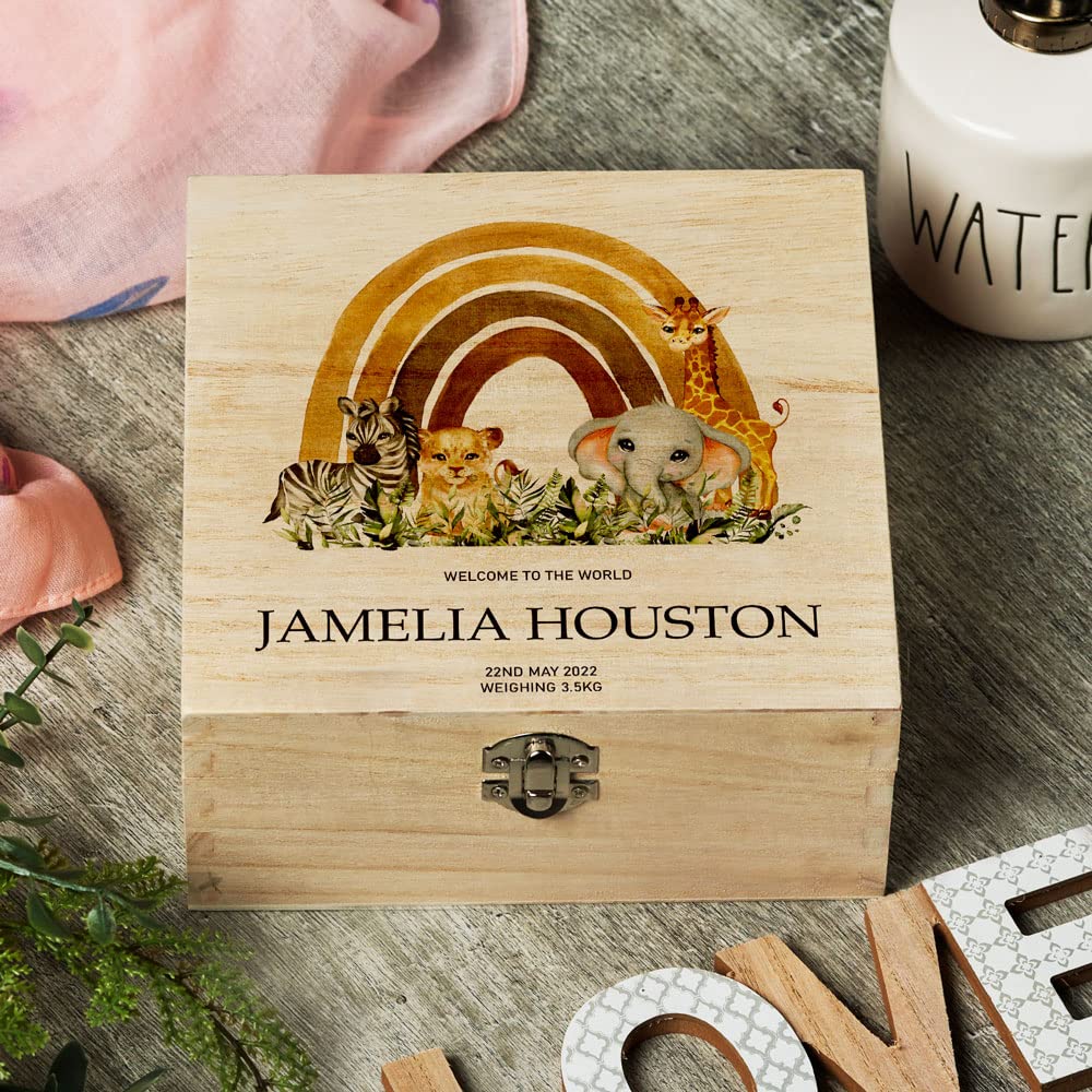 Personalised New Baby Keepsake Wooden Box With Safari Theme