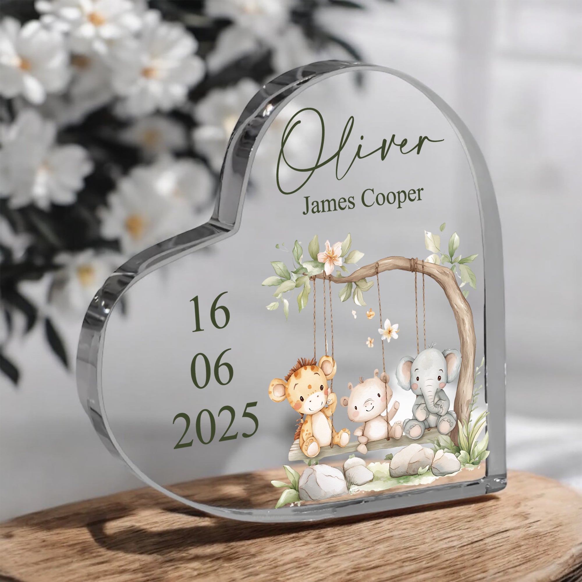Preserve a cherished memory with this personalised newborn gift featuring a heart-shaped acrylic plaque. Expertly crafted from thick acrylic, it allows you to customize with a photo, names, and date to create a truly unique keepsake celebrating your baby’s arrival. Measuring 10 cm in height and width, with a depth of 2 cm, the plaque is an elegant size for display in any nursery or home space. Presented in a luxurious silk-lined box, it offers a sophisticated presentation making it an ideal gift for new parents or family members wanting to commemorate a special moment.