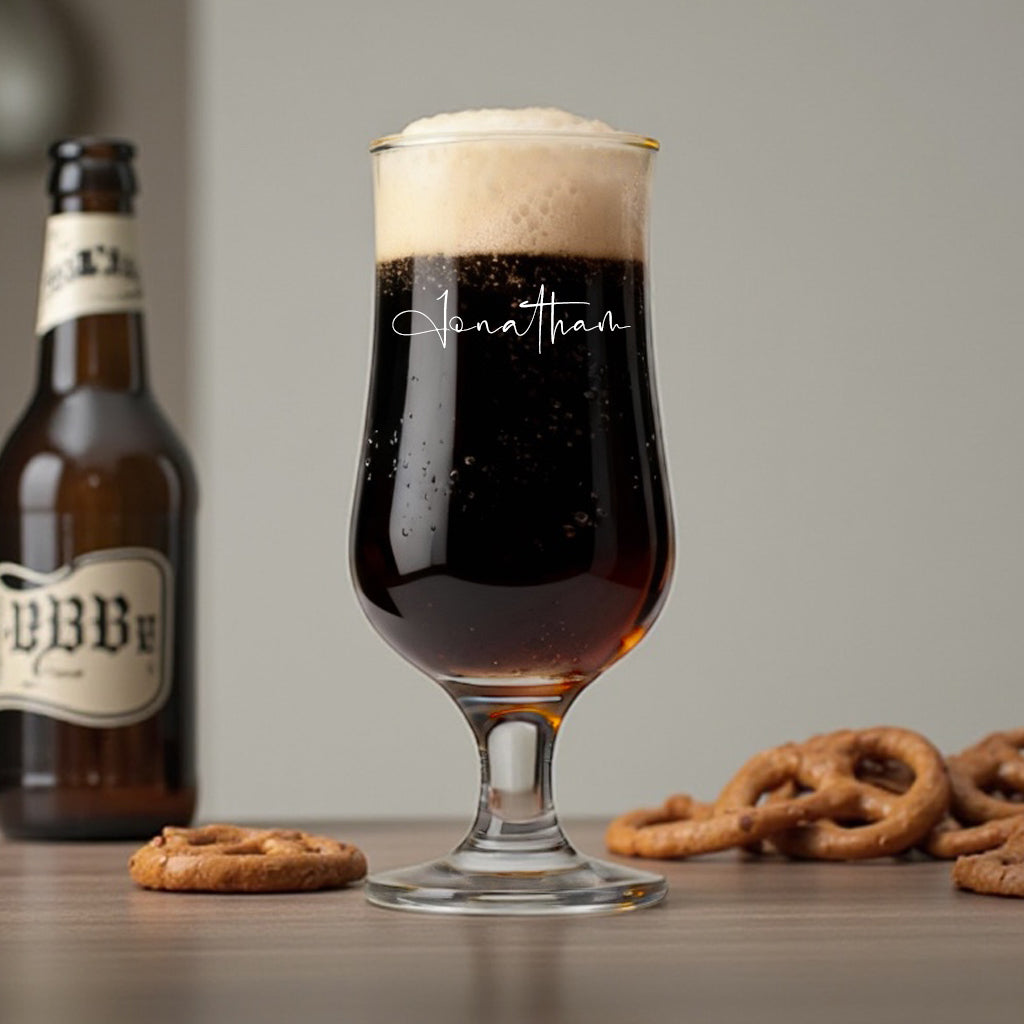 Elevate your beer-drinking experience with this personalised stemmed beer glass, expertly engraved with your custom text. Crafted to combine elegance with individuality, it offers a sophisticated way to enjoy your favourite brews. Perfect for special occasions, gifts, or adding a personal touch to your glassware collection, this glass balances style and comfort while showcasing your unique message.