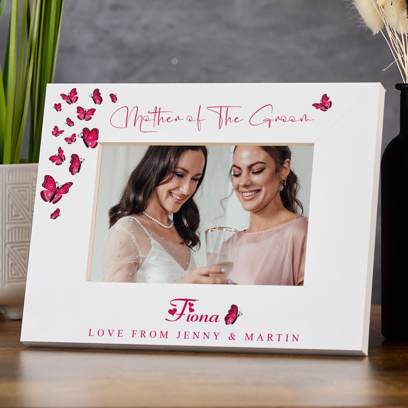 A sleek white photo frame adorned with delicate butterflies, customized with the Mother Of The Groom's name. ...