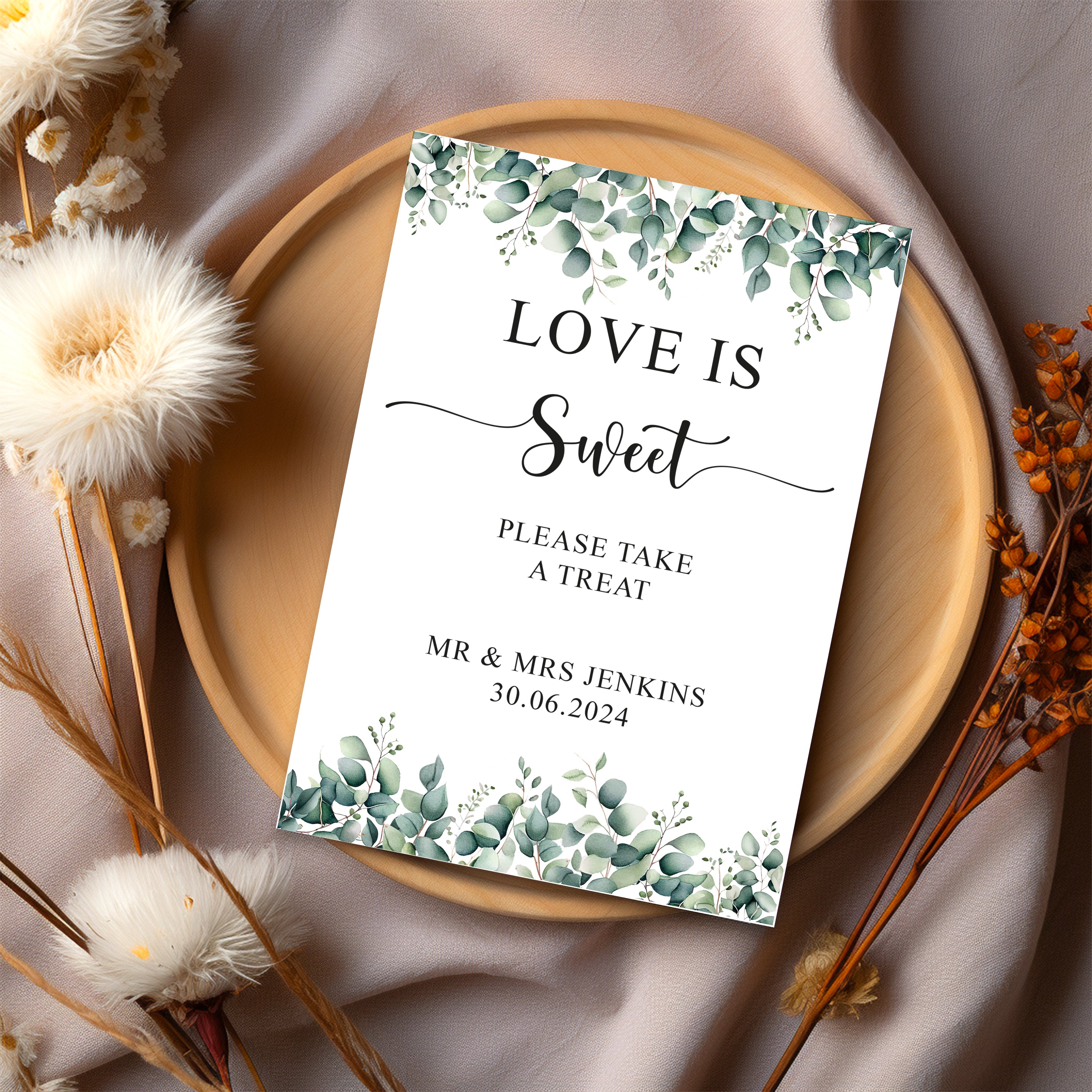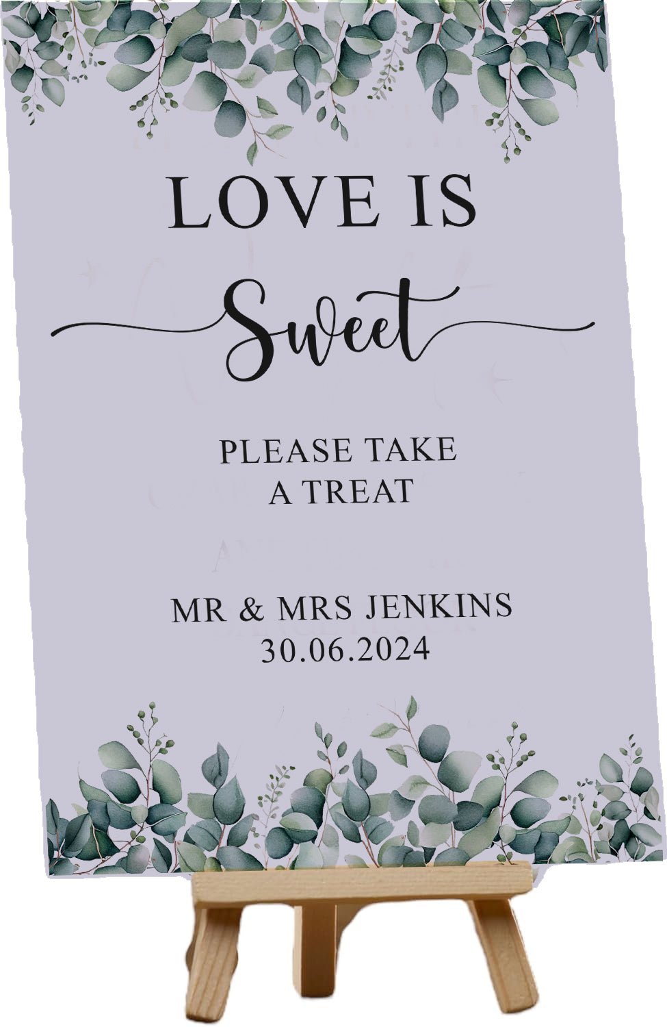 Personalised Wedding Love is Sweet Take a Treat Table Sign With Eucalyptus