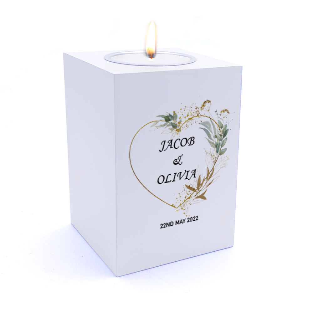 Personalised Wedding Tea Light Gift with Gold Green Leaf Heart