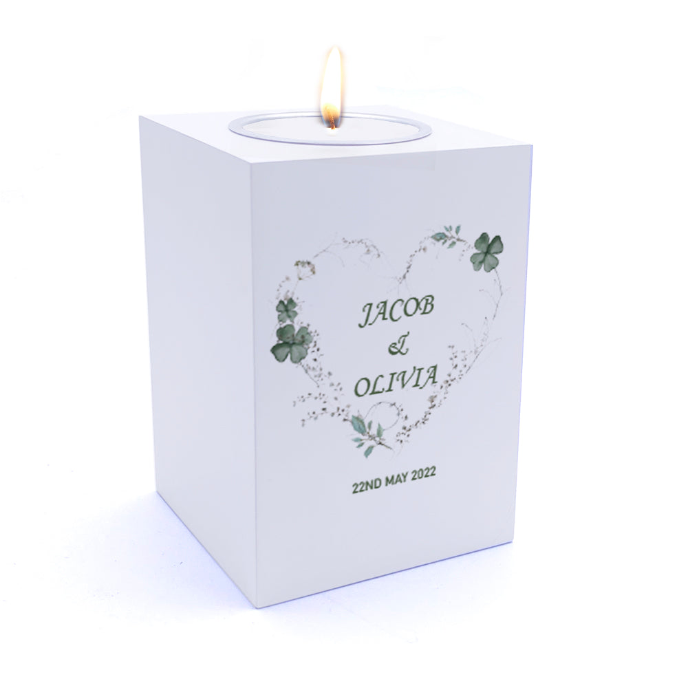 Personalised Wedding Tea Light Gift with Green Clover Leaf Heart