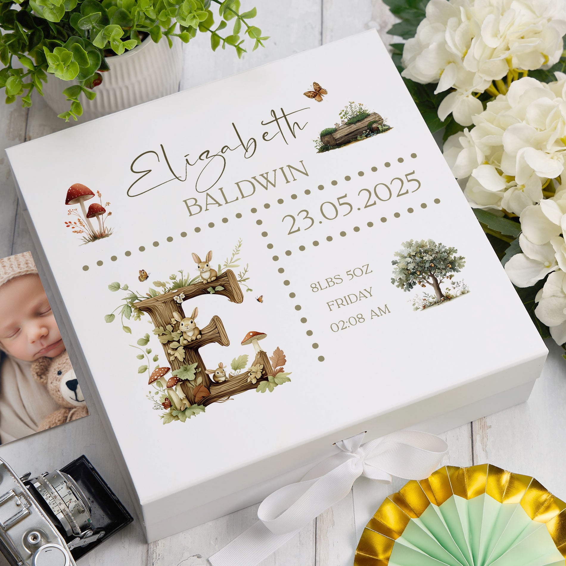 This personalised woodland-themed baby memory keepsake box is a charming way to preserve your child’s most treasured moments. Crafted to include customised birth details, it offers a special space to store mementos such as hospital bracelets, first shoes, and photos. The nature-inspired design adds warmth and character, making it an ideal keepsake to cherish and pass down through generations. Perfect for marking your baby’s early milestones with a personal touch.