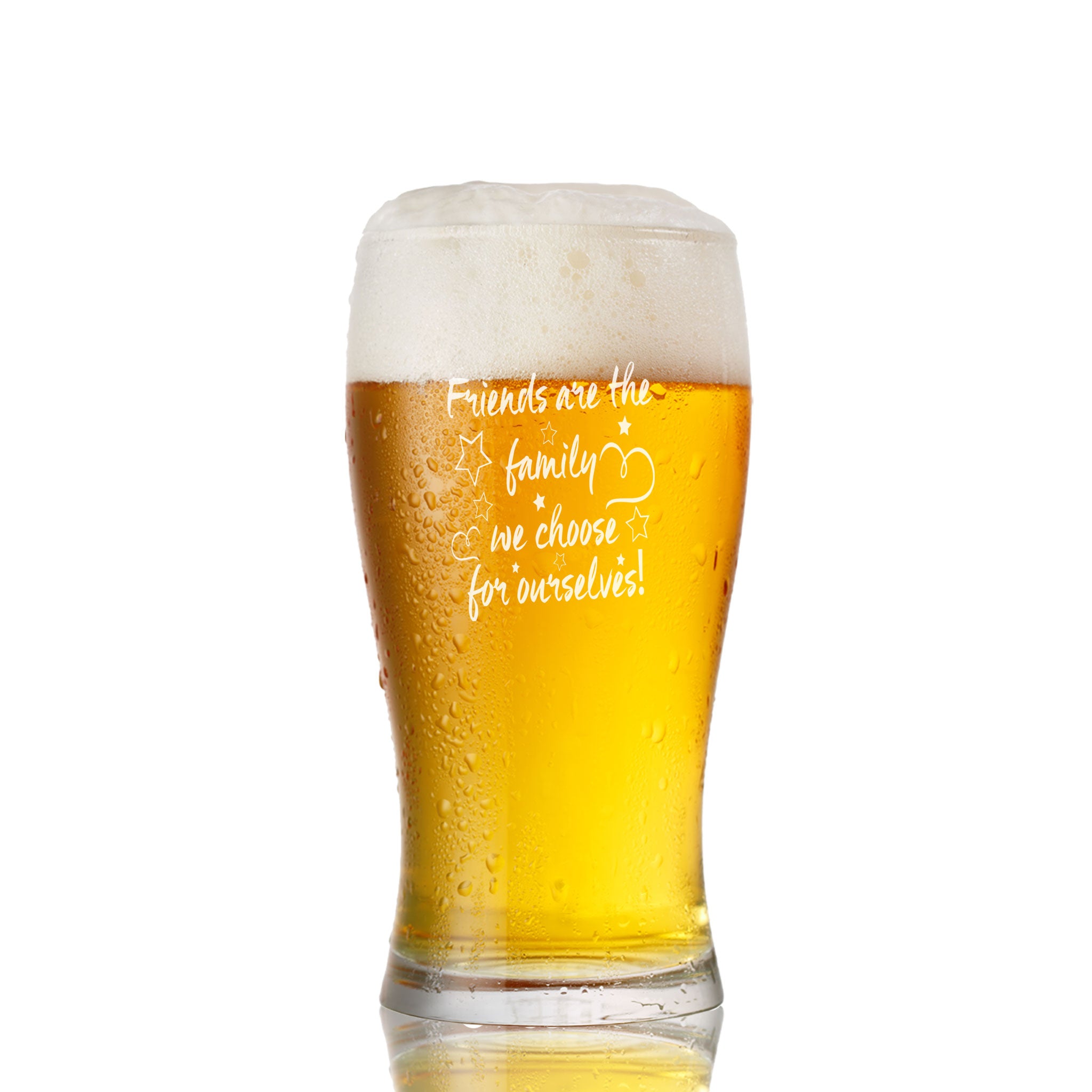 The front of the glass reads "Friends are the family we choose for ourselves". Below we engrave your choice of words. Max 3 lines with up to 4 words per line.