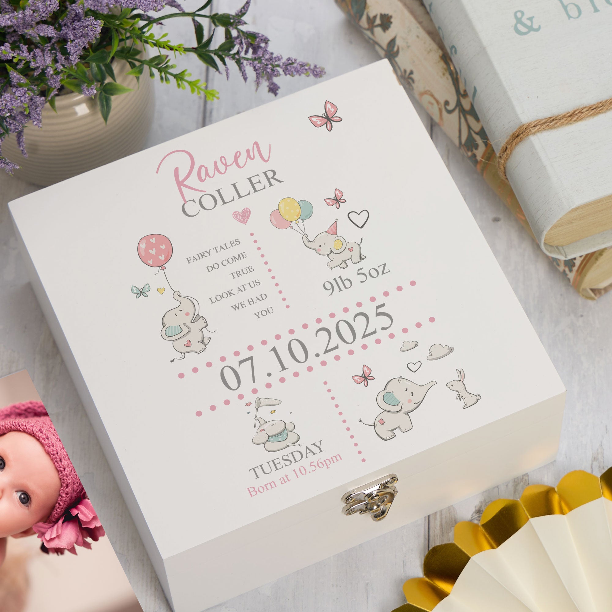 Preserve your daughter's most treasured moments with this personalised keepsake memory box, adorned with a gentle elephants design that brings warmth and character to any nursery or bedroom. Crafted to hold first photographs, hospital bracelets, birth announcements, and other precious mementos, this box becomes a cherished heirloom that grows with your child. The personalisation option allows you to add her name or a meaningful date, making it a truly one-of-a-kind gift for new parents or a thoughtful baby shower present. Built to last, this memory box combines quality craftsmanship with sentimental value, ensuring these fleeting moments are beautifully preserved for years to come.