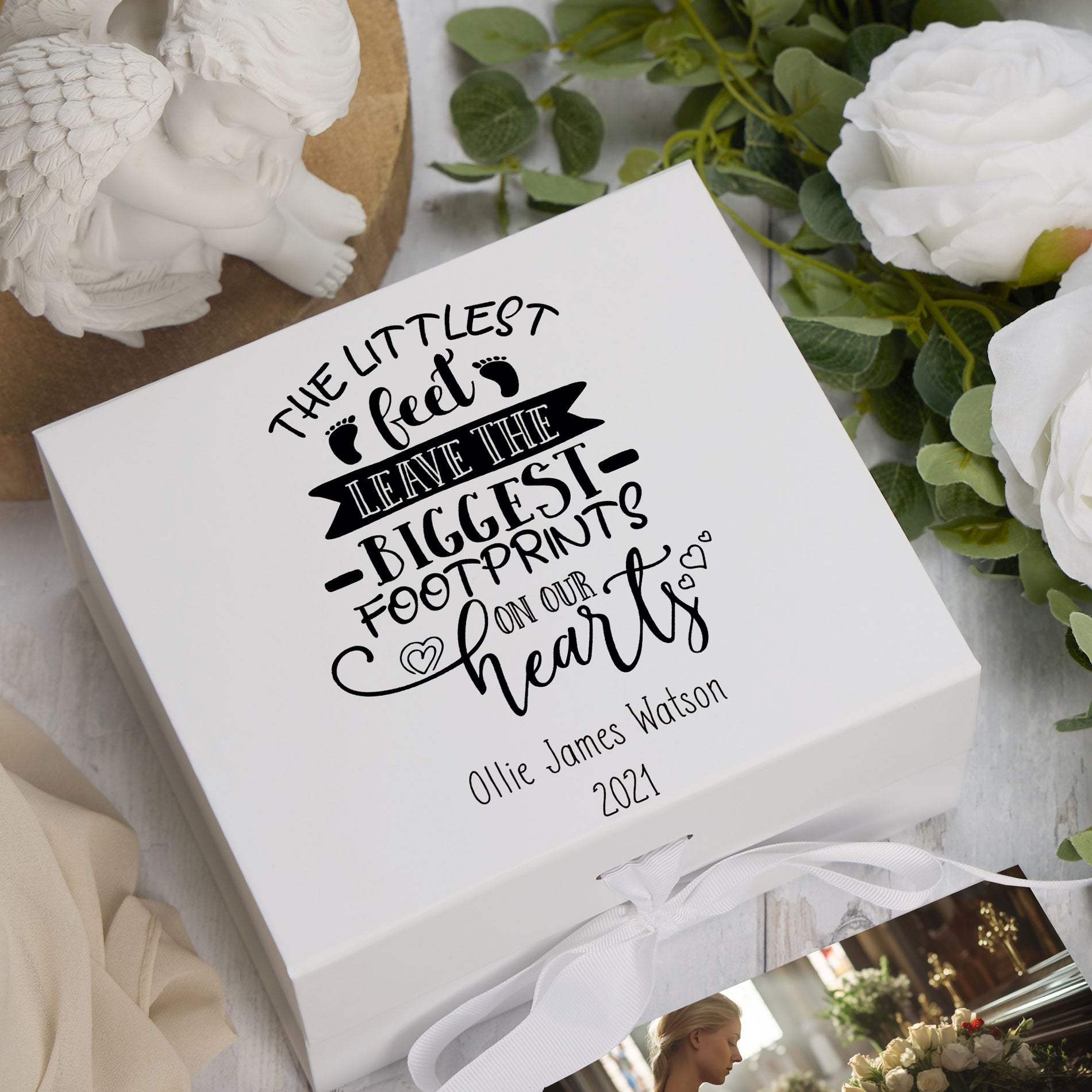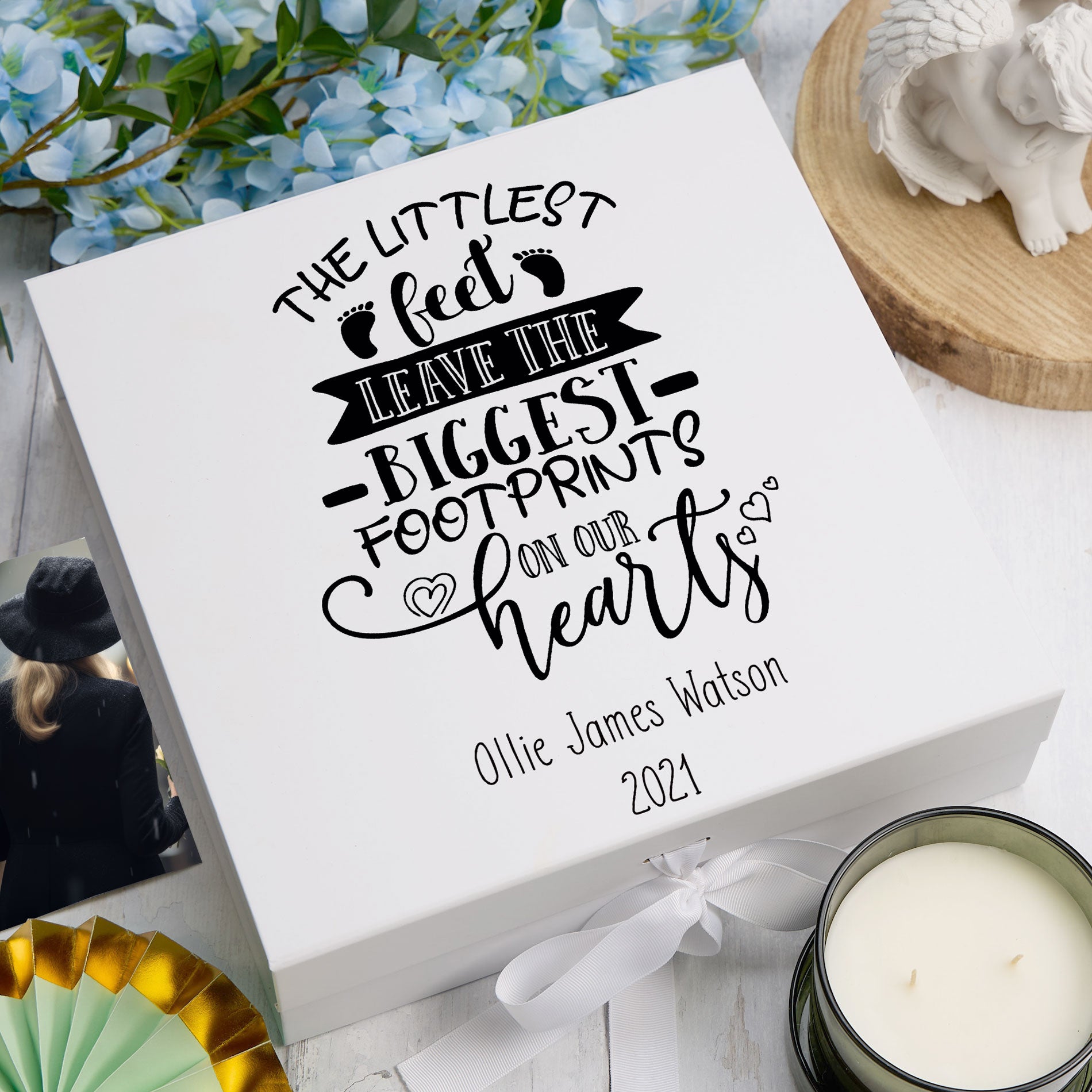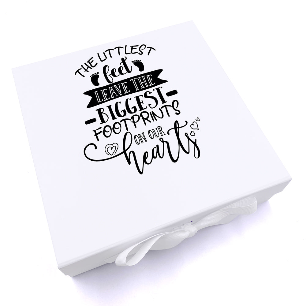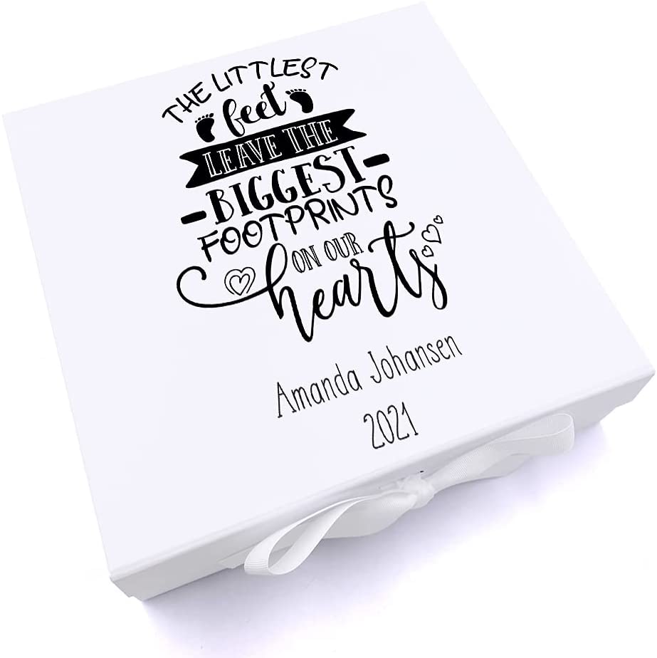 A thoughtfully crafted keepsake designed to honour and preserve precious memories of a little one. This personalised memorial box serves as a dignified space to store meaningful mementos—from tiny footprints and handprints to cherished photographs and momentos. The delicate "Littlest Feet" motif creates a tender tribute, whilst personalisation ensures this becomes a uniquely personal remembrance piece. Ideal for those seeking a respectful way to celebrate and hold close the memory of a beloved child, this keepsake box offers comfort and a lasting legacy.