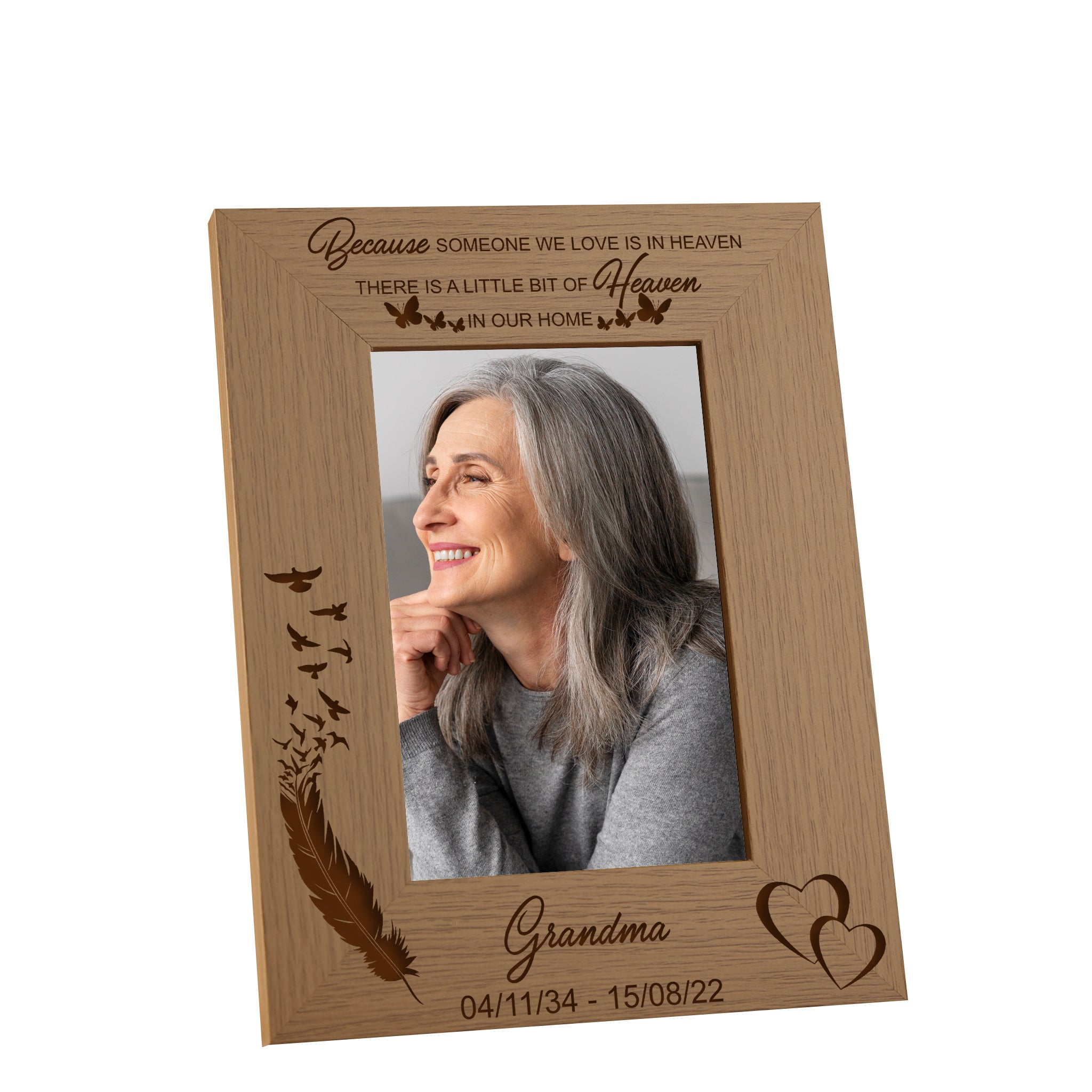 The Personalised "Because Someone We Love Is In Heaven" Remembrance Photo Frame features a beautifully crafted solid wood finish, providing both durability and a warm, natural aesthetic. The frame is engraved with the heartfelt message: "Because someone we love is in heaven... there is a little bit of heaven in our home," serving as a comforting tribute to a cherished loved one. Additionally, you can personalise the bottom engraving with any message of your choice, making this frame an intimate and meaningful keepsake. Available in various sizes to fit your preferred photo dimensions, it offers versatile display options, allowing you to hang it on the wall or stand it flat on a surface. This elegant frame not only preserves memories but adds a touching sentiment to your home.