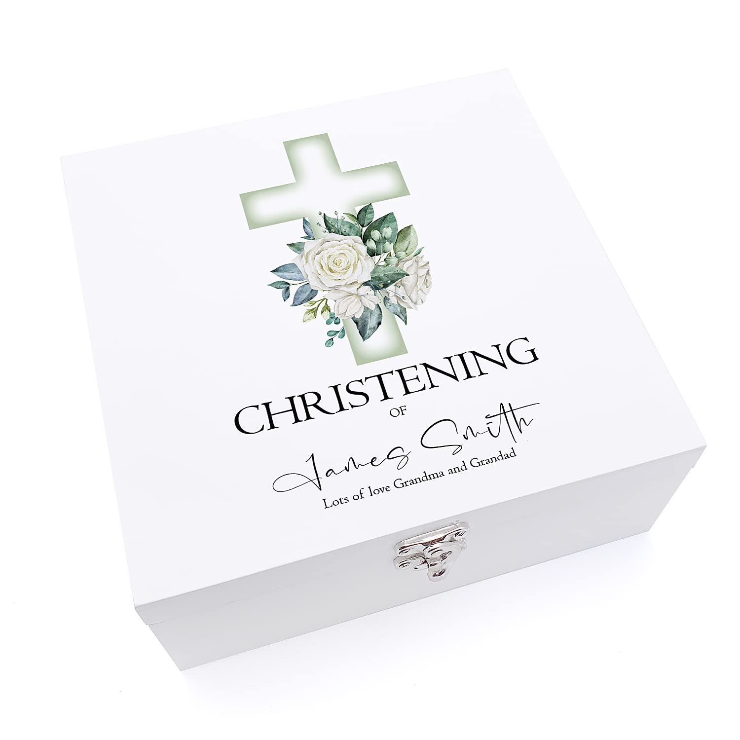 ukgiftstoreonline Personalised Christening Day Wooden Keepsake Memory Box With Green Cross