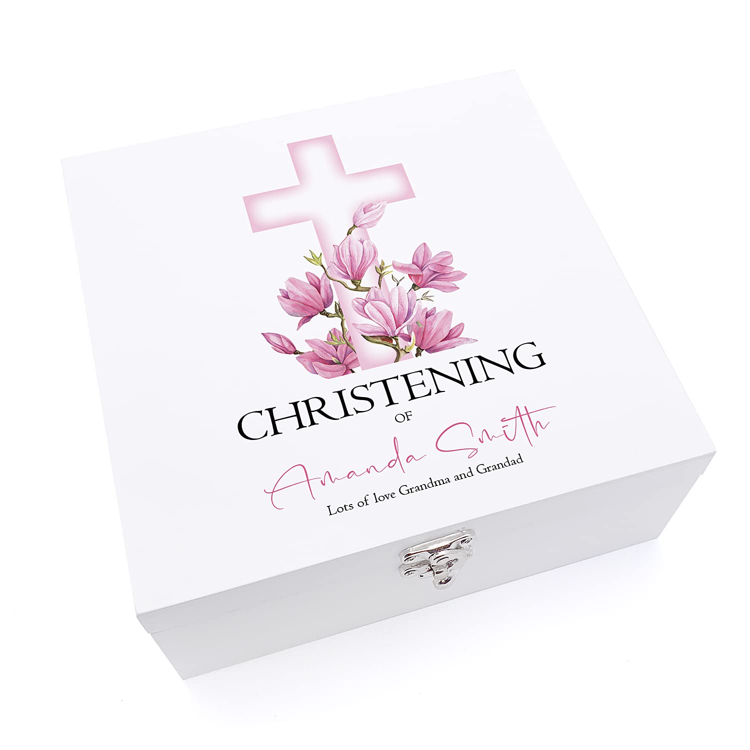 Perfect to fill with gifts, photos and other bits and bobs. Made from a white coated wood with your details printed directly onto the lid using the latest printing technology. The inside of the box has a natural wood finish. The boxes have beautiful chrome plated metal hinges and clasp to hold shut ensuring they last for years. Available in two sizes: Medium: H8 x W20 x D20 cm Large: H9 x W30 x D30 cm