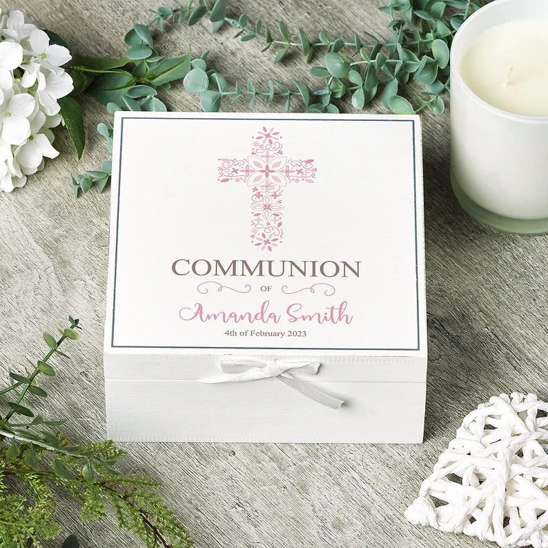 ukgiftstoreonline Personalised Communion Day Vintage Wooden Box Gift With Pink Cross