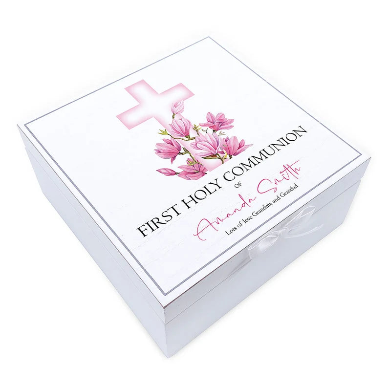 Unique Personalised Communion Wooden Box With Pink Cross - Perfect Keepsake for Memories of Special Day -...