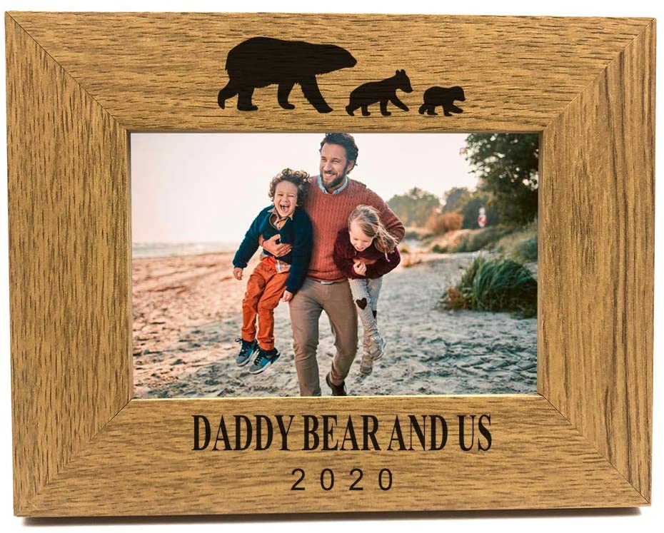 The frame has a oak wood finish with the engraving of Daddy bear and two junior bears on top while underneath you have the wording of "Daddy Bear and Us along with year ". Please select the photo frame size you require, the sizes are for the photo size. There is a stand at the rear so will sit flat on any surface Please simply message us your order during checkout, though should you miss it then please message us from your order.