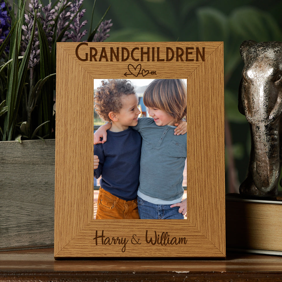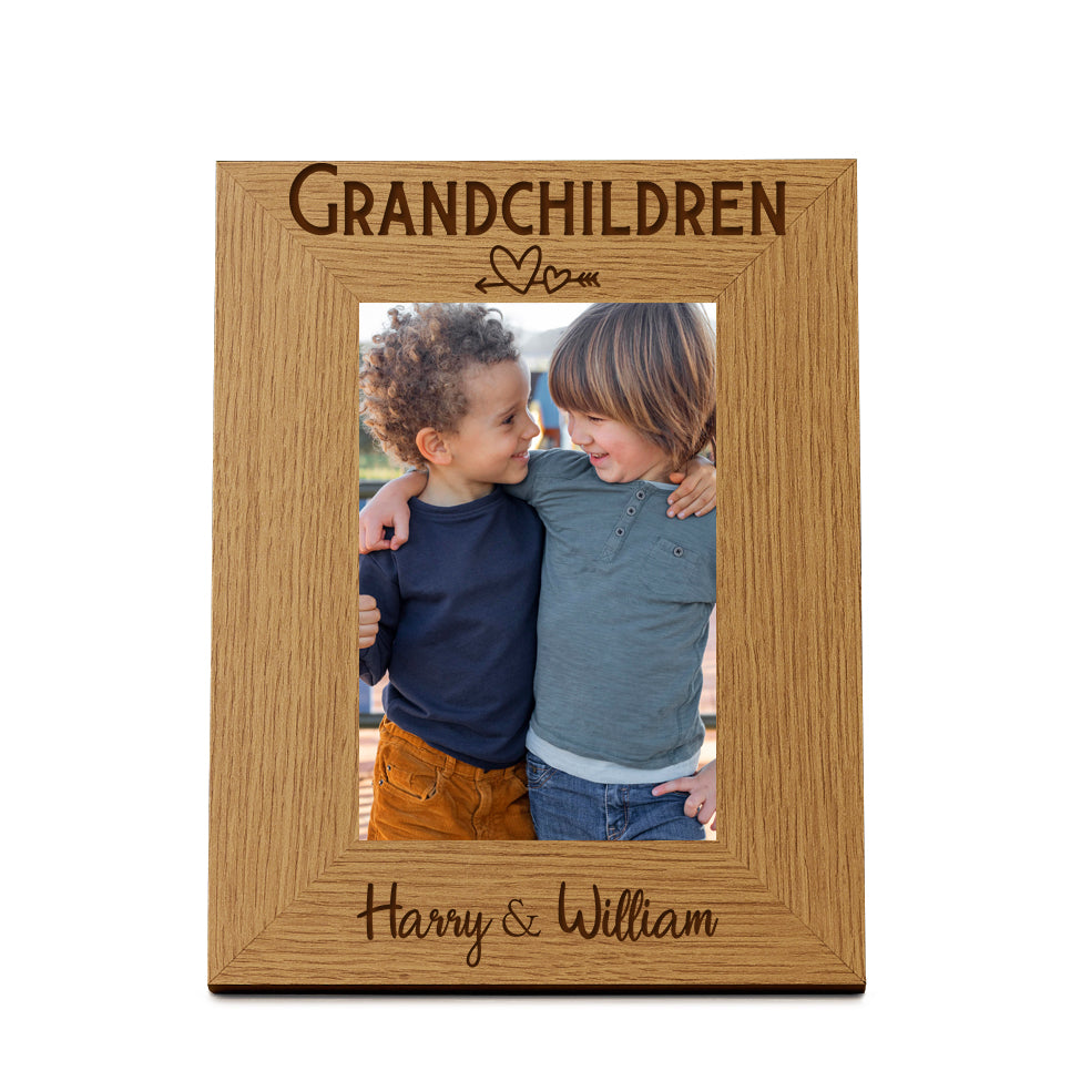 The frame has a oak wood finish with "grandchildren" at the top and the names at bottom of the frame Please select the photo frame size you require, the sizes are for the photo size. There is a stand at the rear so will sit flat on any surface.