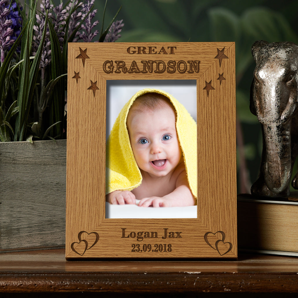 The frame has a solid wood finish with the engraving of "Great Grandson"...and "Your wording" to the bottom along with the name you require. Please select the photo frame size you require, the sizes are for the photo size. Can be both wall hung as well as stood flat. Please simply message us during checkout, though should that be missed then please mail us from your order.