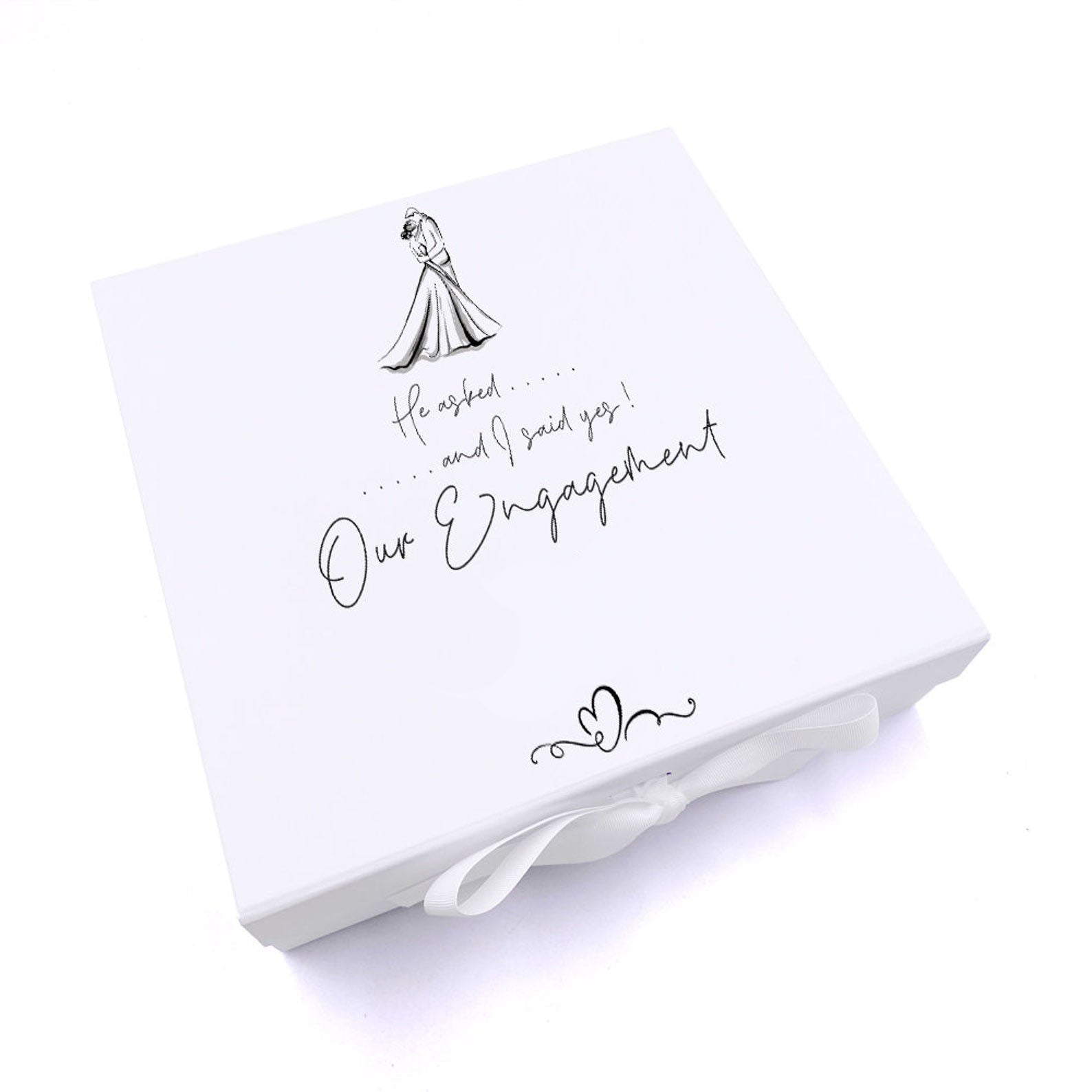 Celebrate your engagement with this bespoke keepsake box, thoughtfully designed to preserve your most treasured moments from the proposal. Featuring customisable personalisation, this elegant memory box serves as a timeless reminder of your "He Asked, I Said Yes" milestone. Perfect for storing mementos, photographs, and sentimental keepsakes, it combines sophisticated craftsmanship with heartfelt sentiment. An ideal gift for newly engaged couples seeking a meaningful way to commemorate their journey together.