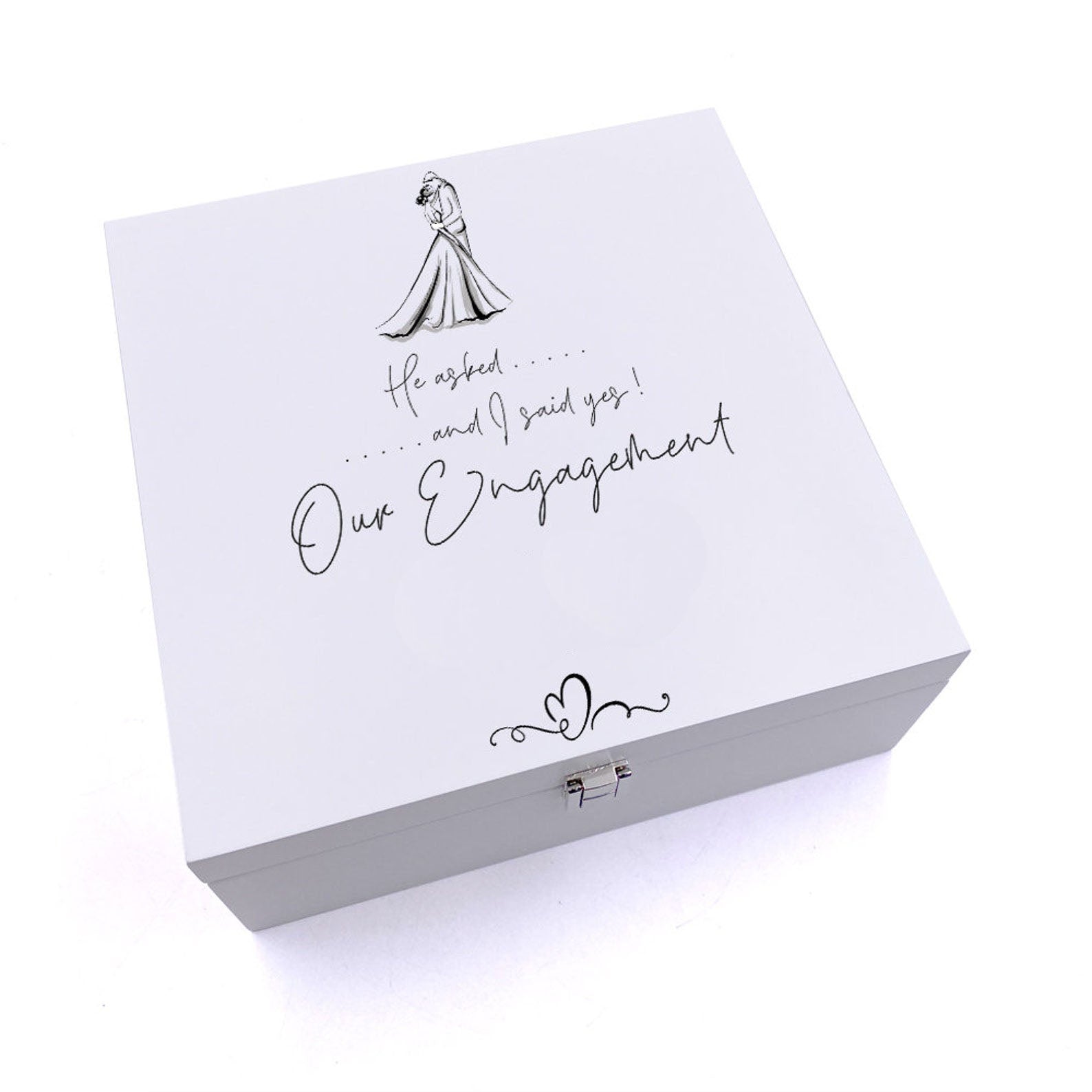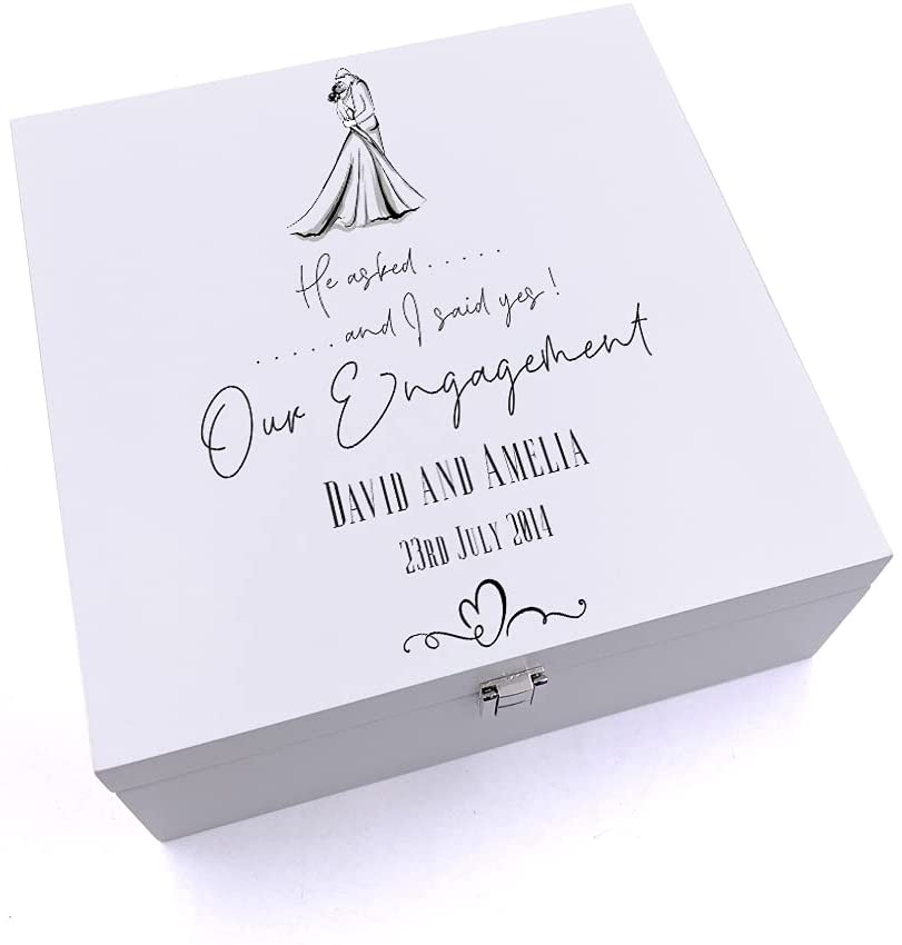 personalised with couple names and date If you are looking for an extra special gift then these keepsake boxes are sure to be cherished and filled with mementos along the years. Perfect to fill with gifts, photos and other bits and bobs. Made from a white coated wood with your details printed directly onto the lid using the latest printing technology. The inside of the box has a natural wood finish. The boxes have beautiful chrome plated metal hinges and clasp to hold shut ensuring they last for years. Dimensions: H8 x W20 x D20cm